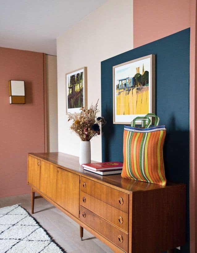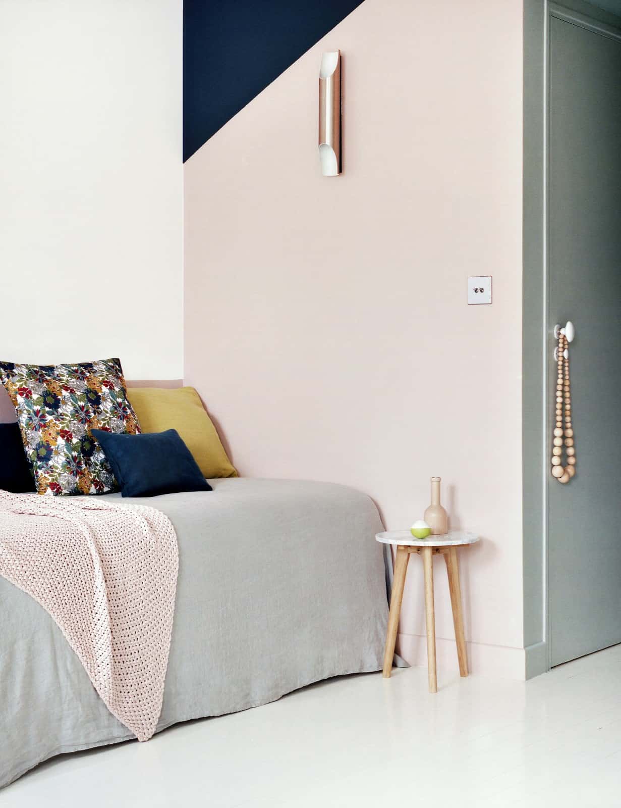 J’adore cette idée de réaliser des formes graphiques sur un mur, cela peut être un triangle, des superpositions de rectangles, des cercles, tout est possible ! Cela donne énormément de caractère à votre pièce. A cela vous pouvez ajouter un effet d’optique intéressant comme nous le verrons après.