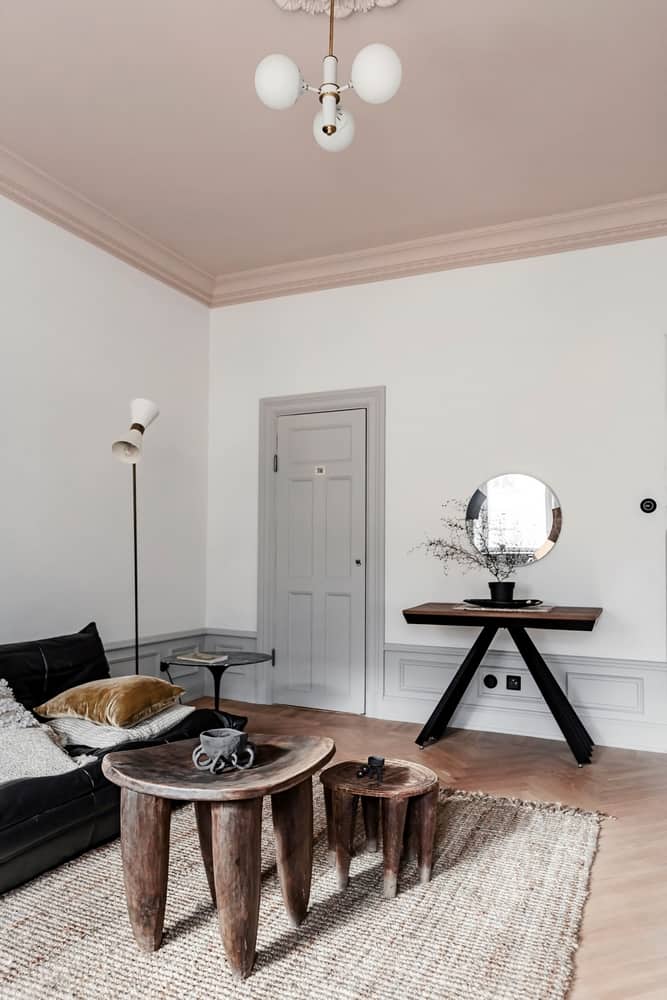 La peinture peut être un merveilleux moyens de changer les dimensions d’une pièce, de délimiter les espaces, et de créer des effets d’optique intéressants et graphiques. On peut alors dépasser la dimensions des murs et aller jusqu’au plafond ou même jusqu’au sol.