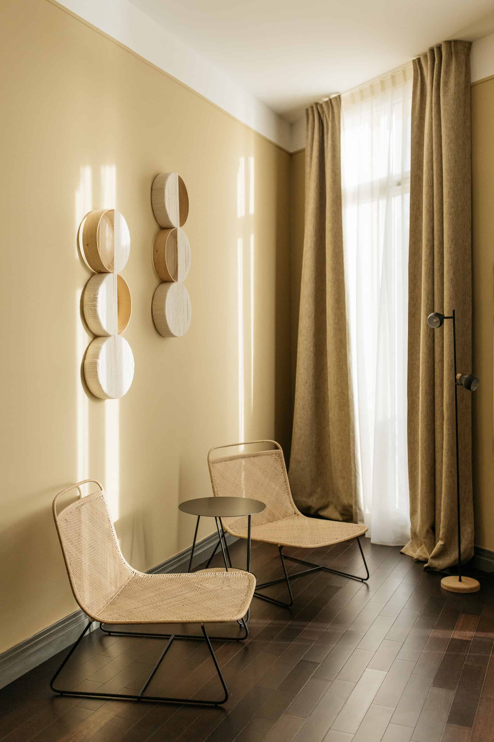 Les 48 chambres répondent à trois thèmes qui conjuguent habilement deux teintes : le jaune épice et le vert bronze en référence aux terres chaudes d’Afrique, le vert menthe et bleu Majorelle à l’image du Maroc et enfin, le rose et turquoise à la Ricardo Bofill. On retrouve dans les chambres du bois, brut ou d’ébène, du rotin, du métal et autres joncs tressés. L’accent est mis sur des matériaux naturels avec des chaises en bois brun et cannages clairs, des rideaux en toile de jute, des tapis de jute comme tête de lit, des poufs kilim, des suspensions en osier ainsi que des poignées martelées et mobilier en pierre de lave. Dans les salles de bain, les murs se plaisent en carreaux de zellige traditionnels.