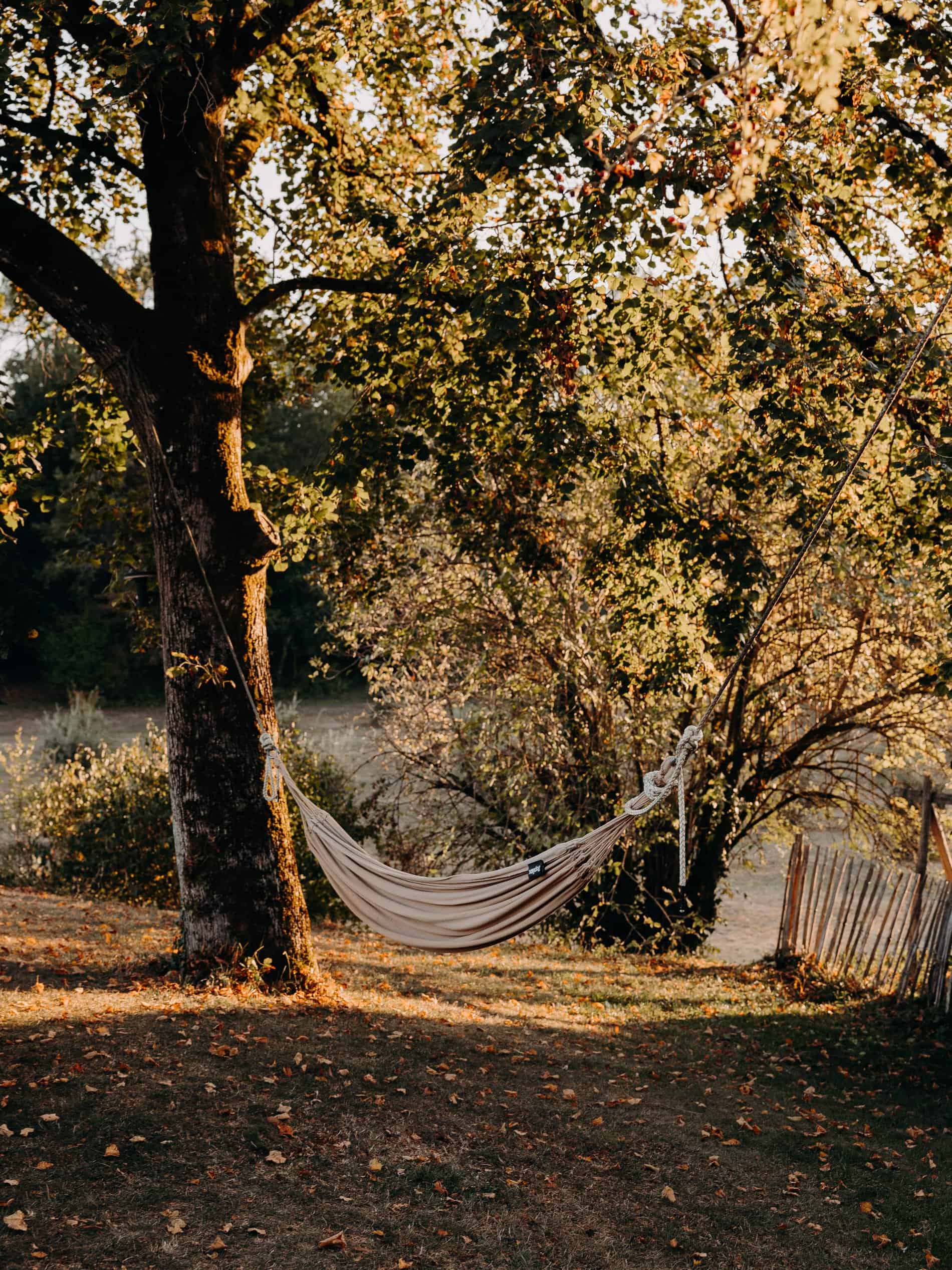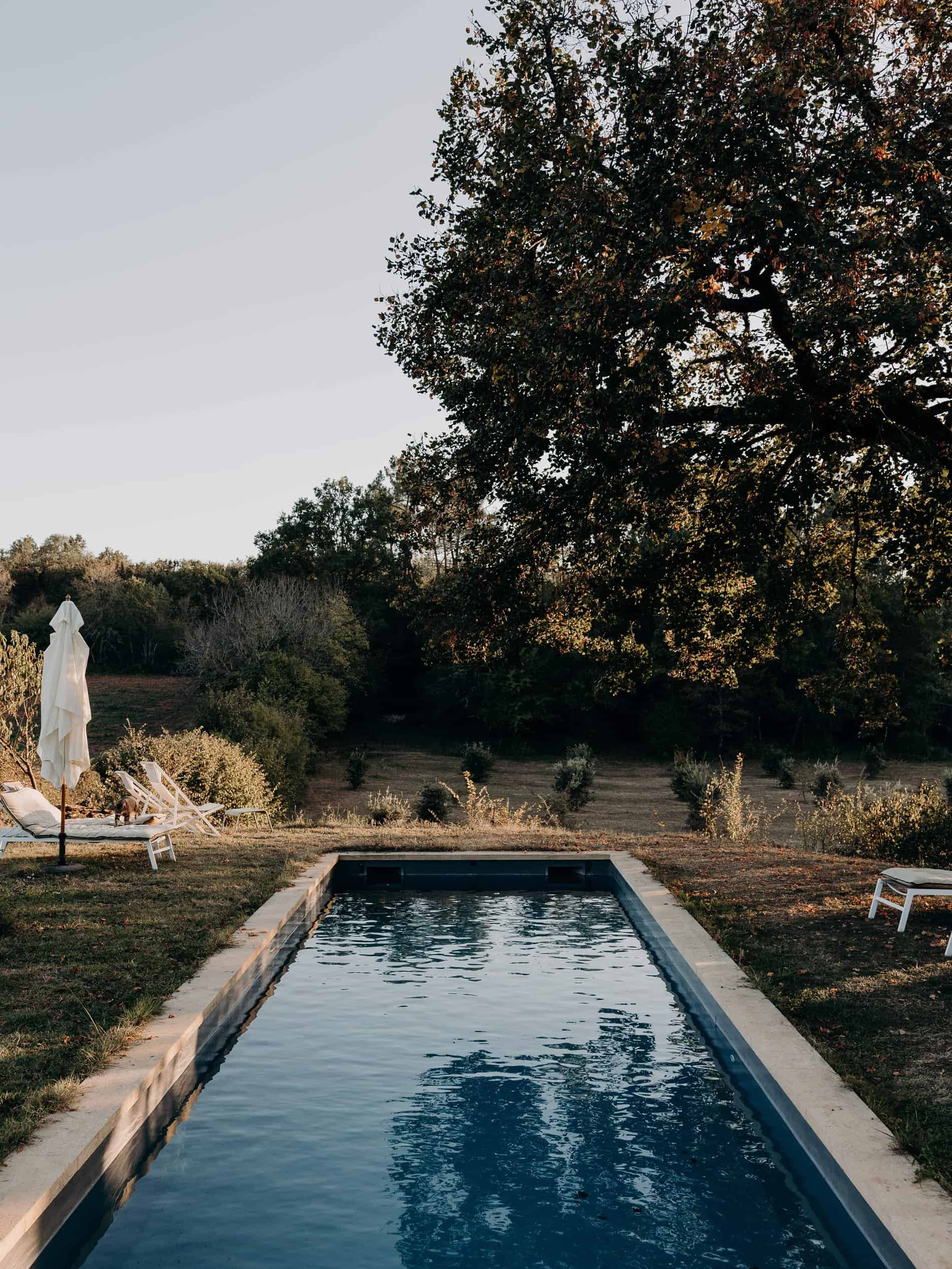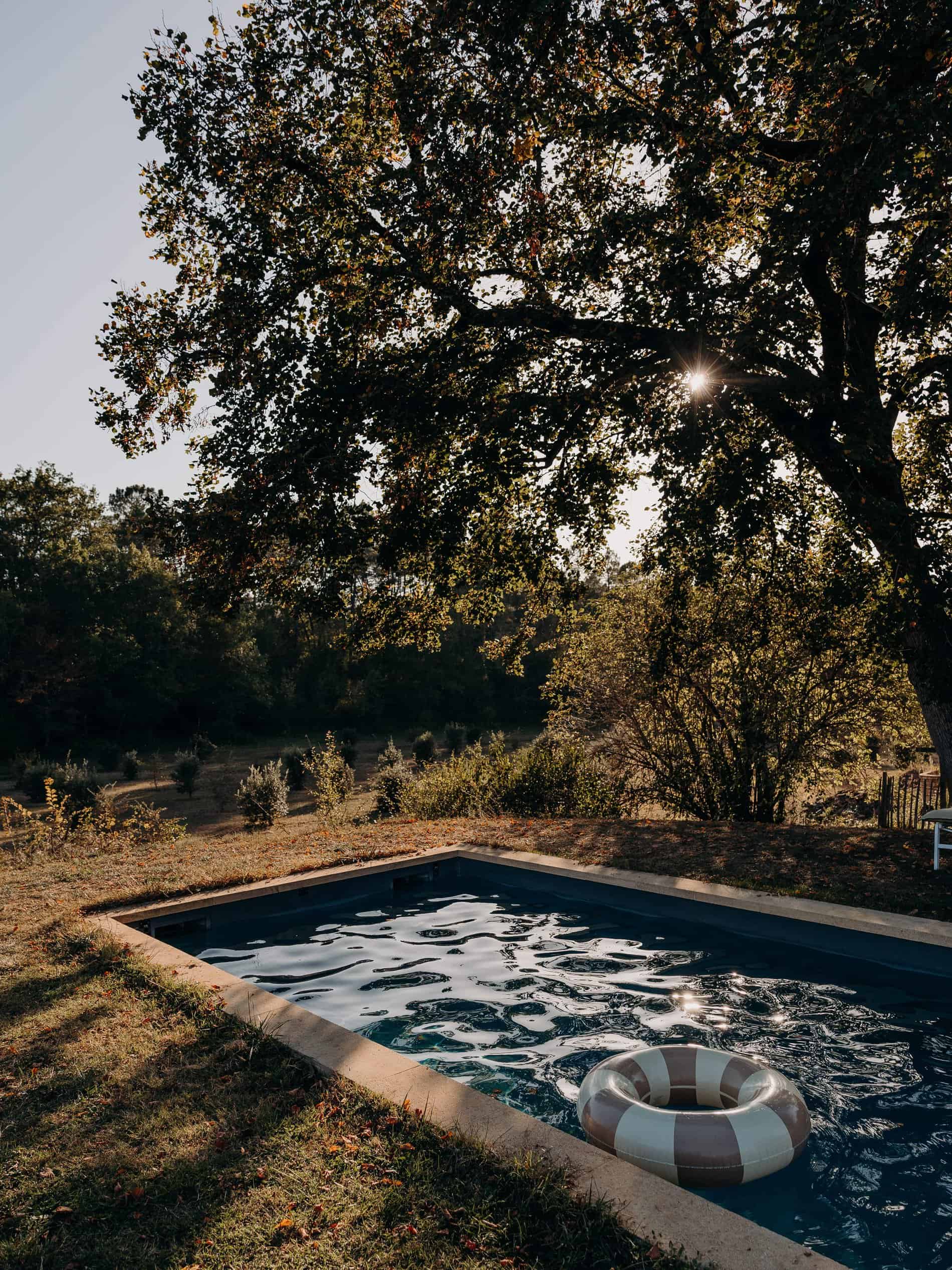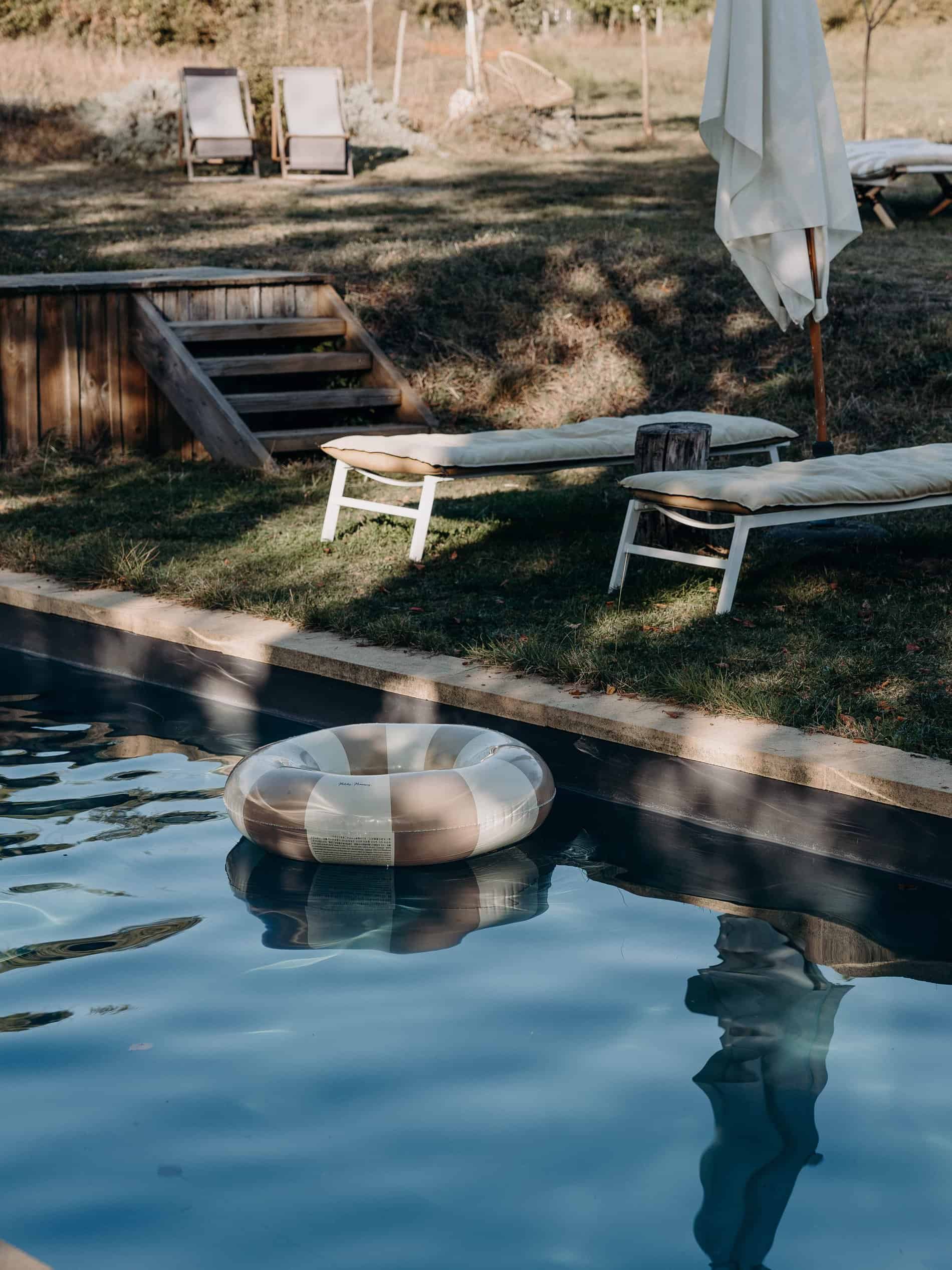 Côté jardin, c’est tout aussi beau, tout est calme. On adore la vue sur les champs et la forêt, le couloir de nage pour se rafraîchir, les transats ou le hamac pour se prélasser à l’ombre d’un arbre. Plusieurs espaces ont été aménagés un peu partout, c’est parfait pour avoir aussi un petit moment d’intimité. Le cadre est idyllique, la nature est partout.
