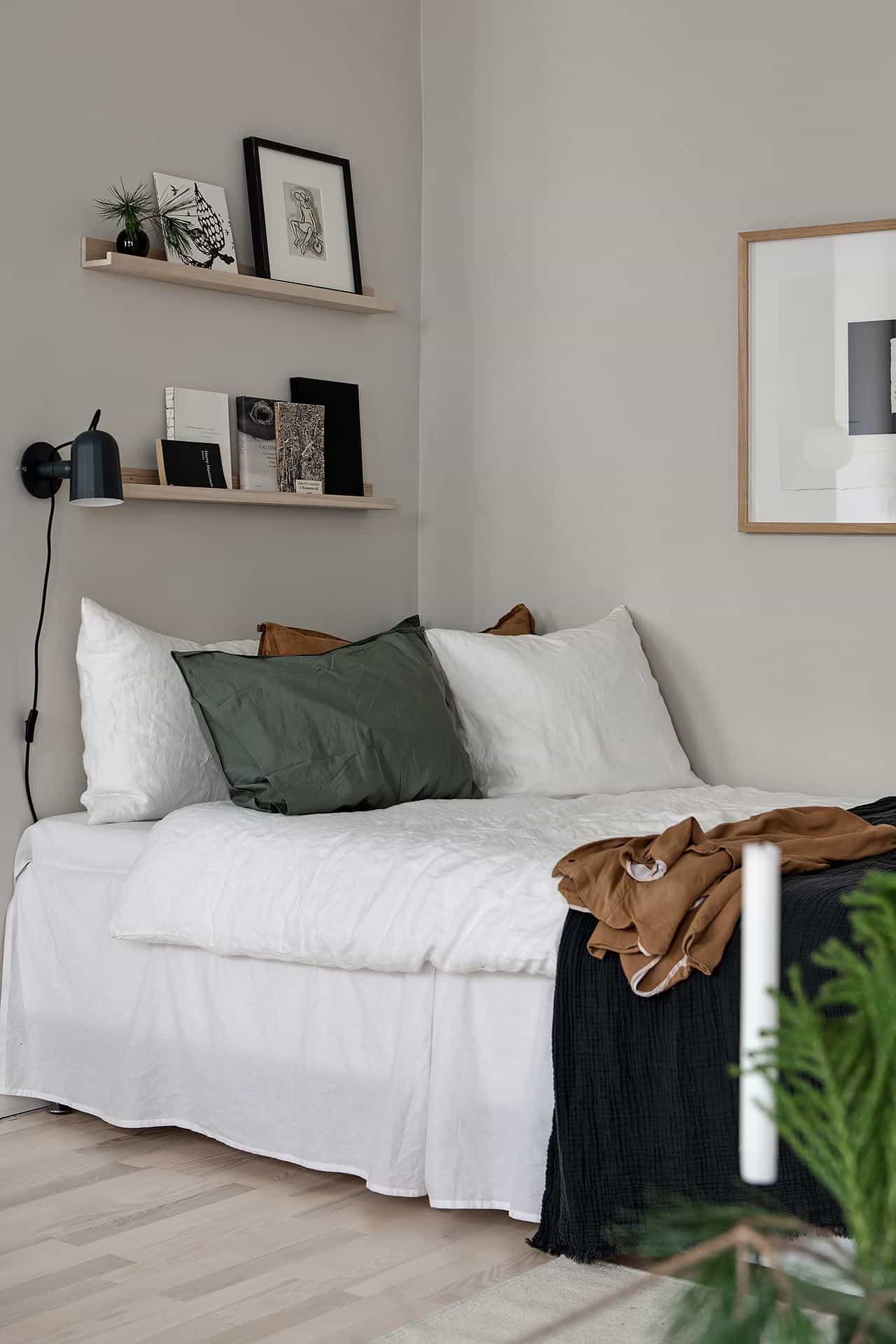 Quand on a peu d’espace, le mieux est encore de pouvoir miser sur de jolis accessoires déco qui feront toute la différence. Il ne faut pas hésiter de mettre un joli plaid tout doux, des coussins à foison, un linge de lit de qualité…bref, on suit les mêmes conseils que pour « vraie » chambre, on rend ce coin nuit confortable et accueillant. C’est dans les détails que l’on change l’ambiance d’une pièce. N’oubliez pas de positionner une petite table de nuit avec une lumière d’appoint. Et pourquoi pas un petit bouquet de fleurs, ou des magazines à disposition?
