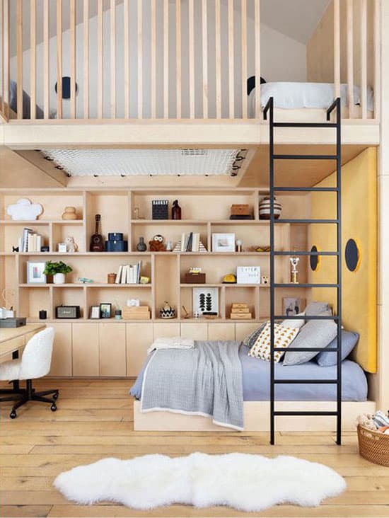 Pour donner une ambiance moderne, j’aime beaucoup cette idée d’utiliser une rambarde avec du grillage. Il y a un côté original et contemporain qui est juste parfait pour un intérieur épuré. On voit même ici qu’il peut se marier avec un intérieur plus rustique pour un mélange de style optimal.