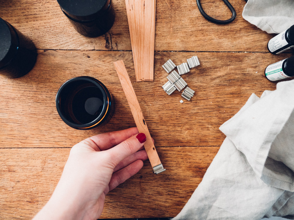 Disposer la mèches en bois sur leurs socles en métal dans le récipient.