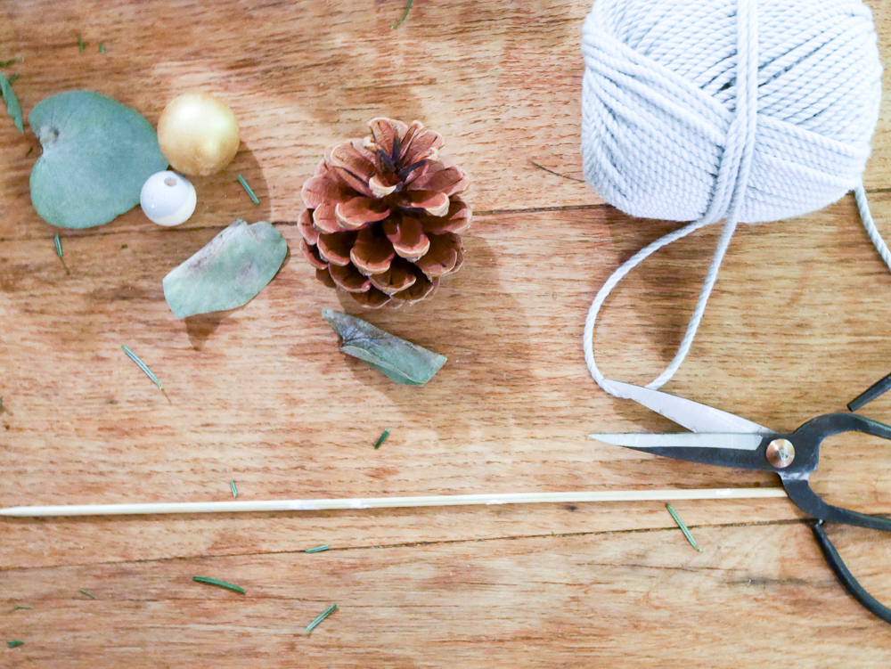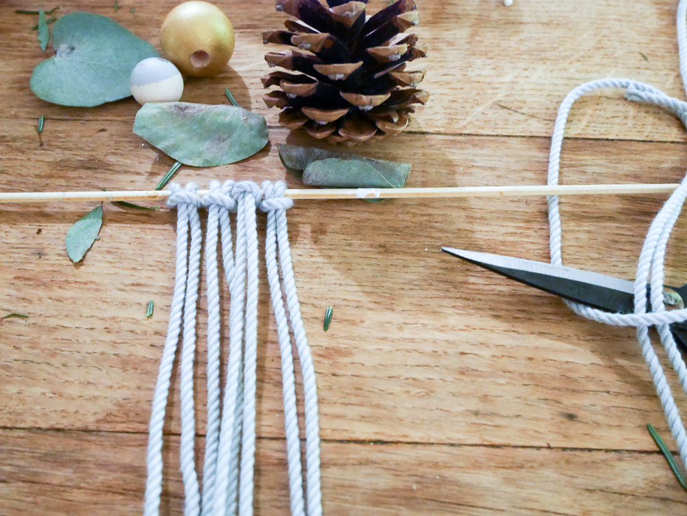 Comme je vous le disais plus haut, je suis partie de la branche de sapin comme base. J’ai attaché la ficelle « Bake Twine » aux extrémités. J’ai rajouté l’eucalyptus à la base du sapin avec mon fil vert. Ensuite, avec mon pic en bois, j’ai réalisé le pendant macramé en nouant les cordes tout le long. J’ai découpé des tailles de cordes différentes pour créer un effet. Je l’ai ensuite fixé à la base avec mon fil spécial création florale.