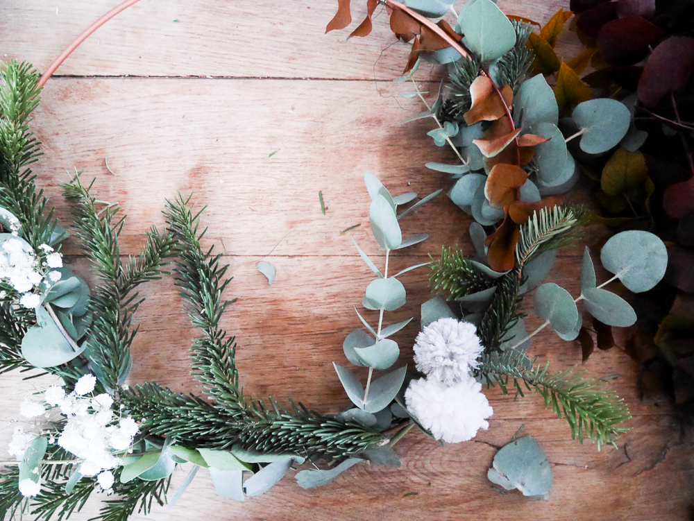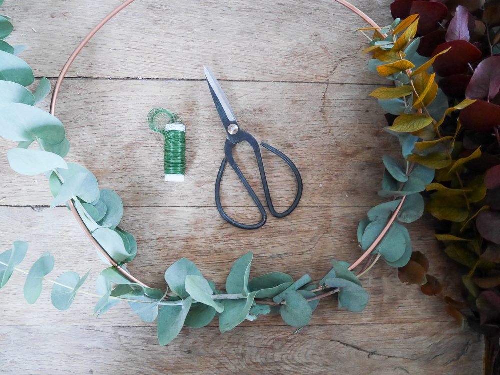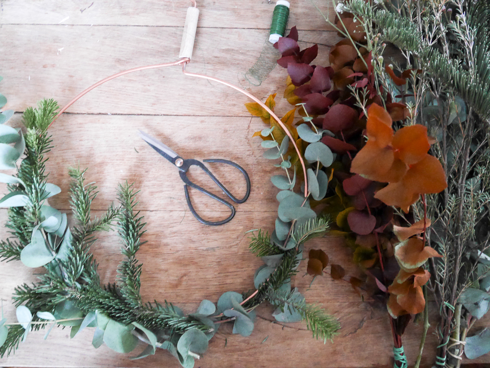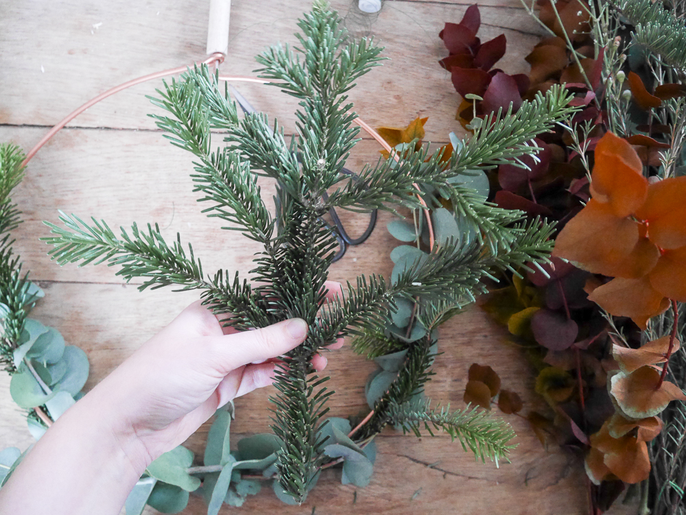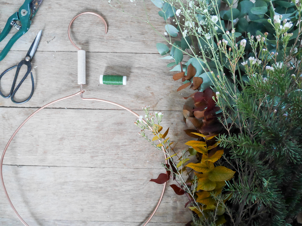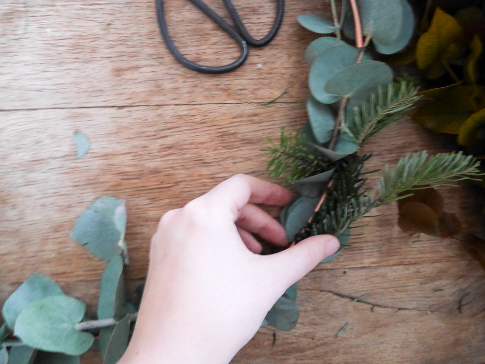 Pour la couronne ronde, Il faut tout d’abord commencer par le feuillage de base que vous désirez et l’accrocher à l’aide du fil autour du cintre. J’ai commencé par plusieurs branches d’eucalyptus.