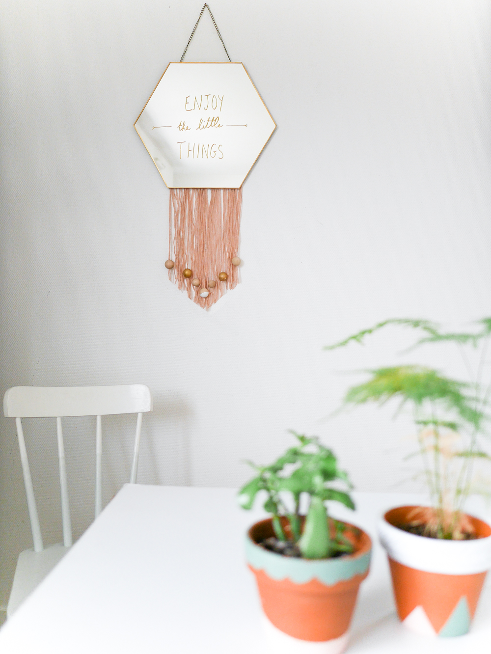 C’est la touche ultime pour apporter cet esprit folk et bohème à notre chambre. Si vous voulez voir un peu plus à quoi ressemble ma chambre, je vous laisse découvrir ce premier article sur notre chambre, le DIY du portant cuivre, et bientôt notre mur en bois. J’avais repéré sur le site Urban Outfitters un miroir en forme de lune, c’était sur celui-ci que j’avais jeté mon dévolu mais ils en avaient finalement plu, je me suis donc rabattu sur ce magnifique miroir à chainette doré et hexagonal.