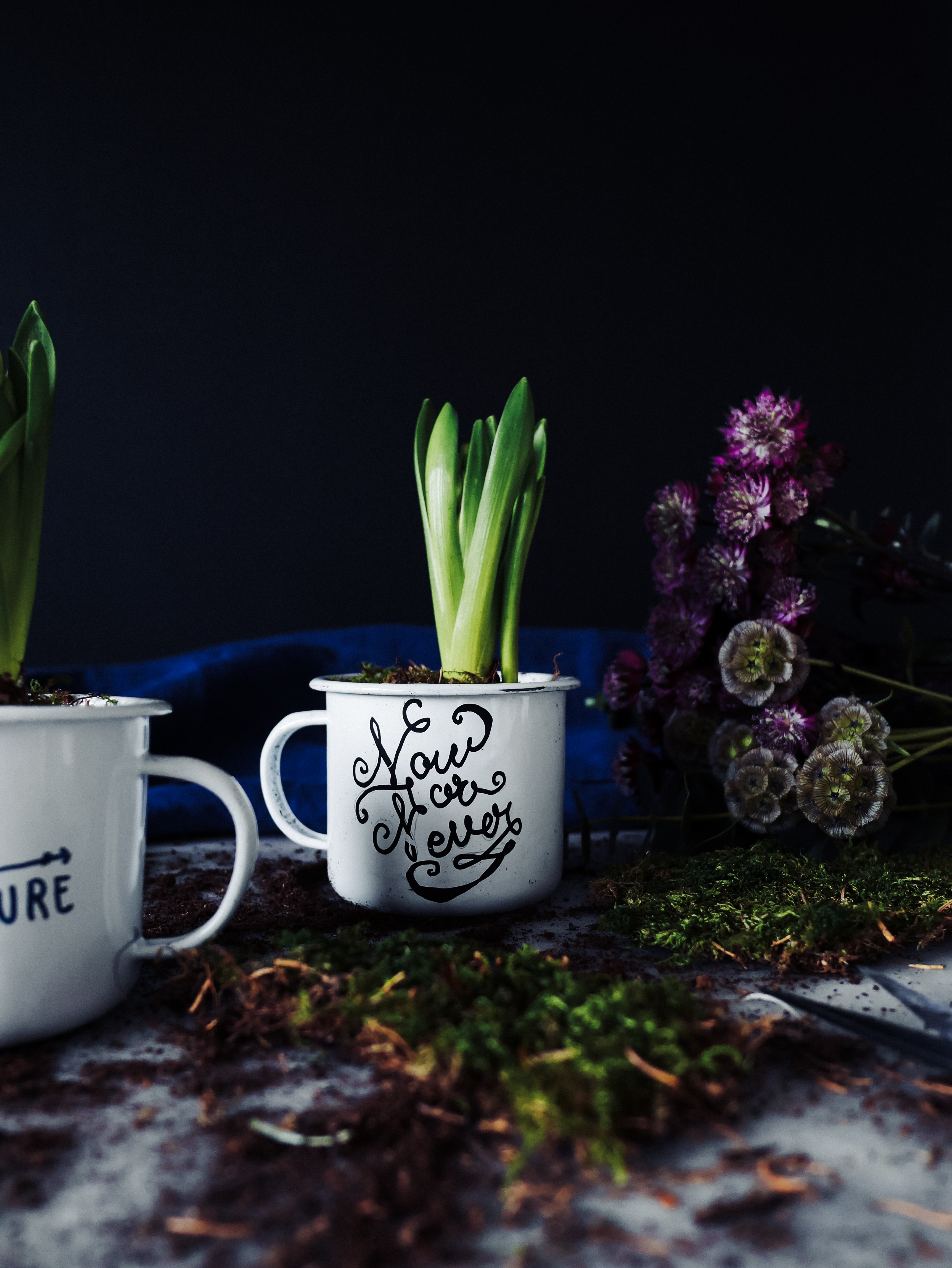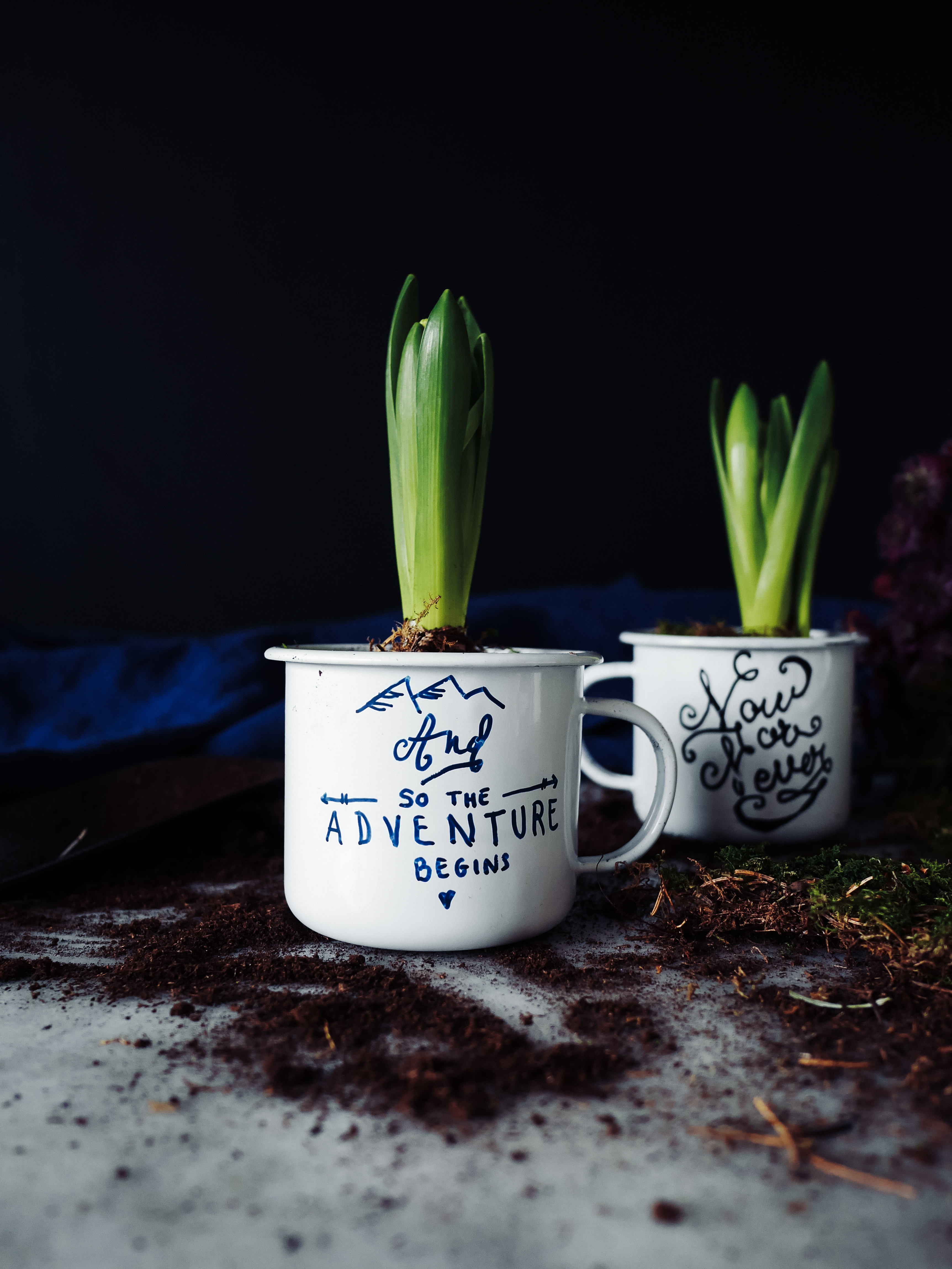 J’adore ces mugs en émail résolument d’inspirations vintages qui me rappellent les voyages, la montagne, le plein air. Alors grâce à ces petits mugs dénichés lors de mon séjour en Normandie à L’empreinte Décoration, j’ai eu envie de réaliser quelques personnalisations pour y glisser de jolie jacinthes. Un beau cadeau et personnalisé en plus !