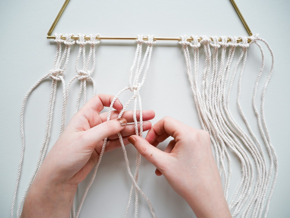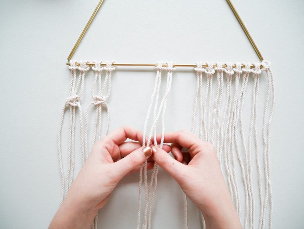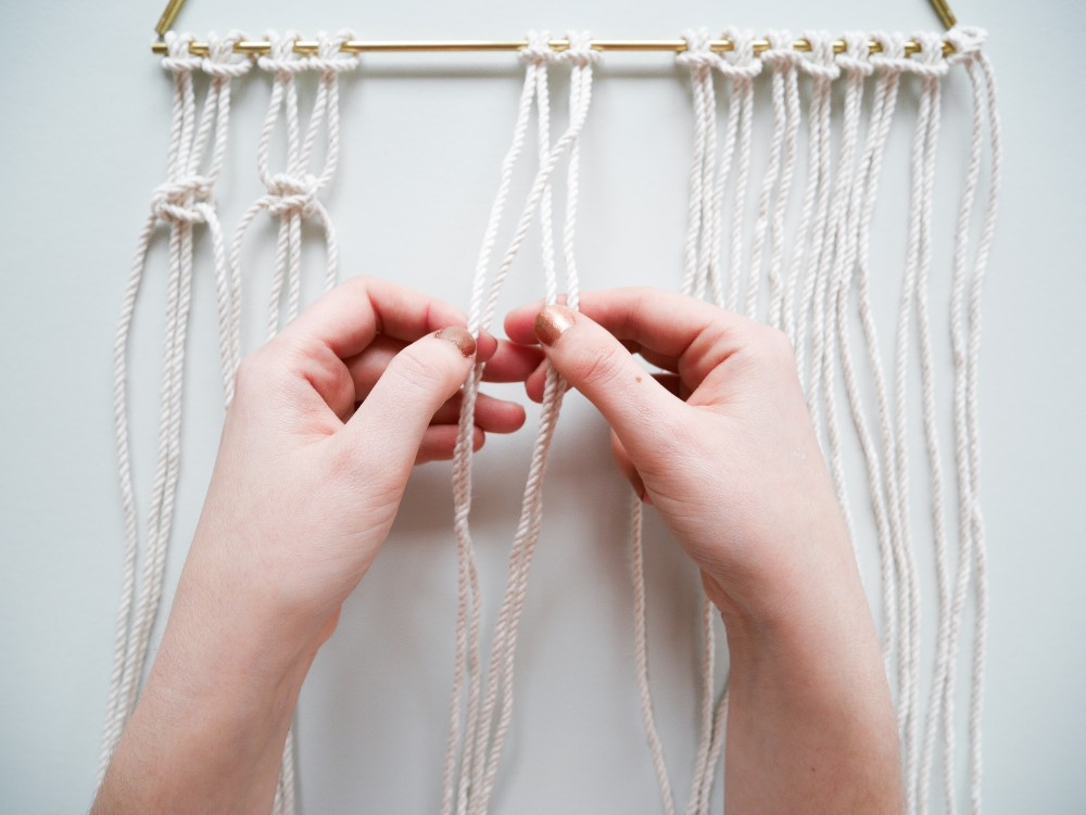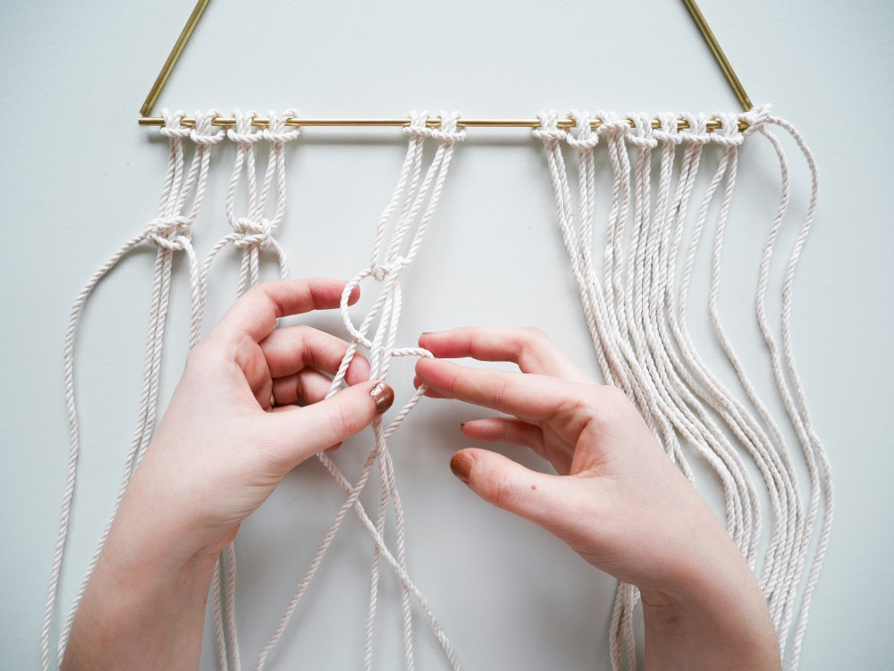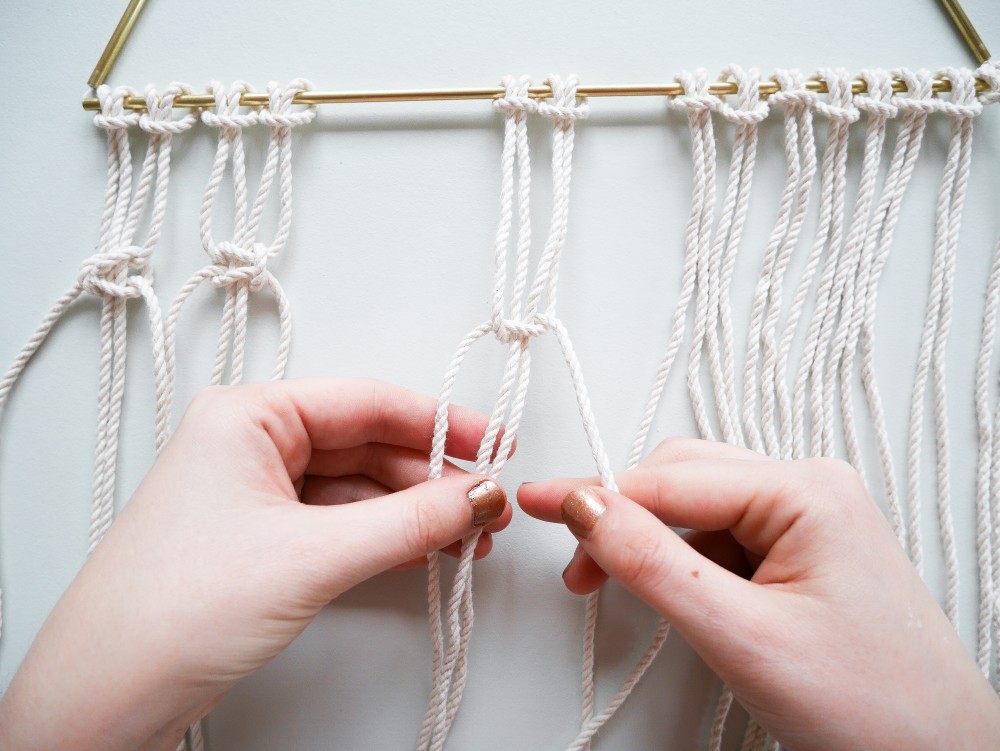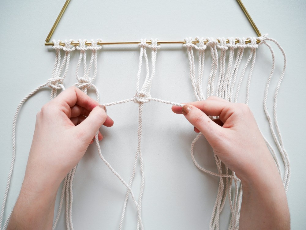 Ensuite, on réalise les noeuds plats du macramé à l’aide d’un groupe de 4. En prenant le fils le plus le plus à droite et le faire passer devant le groupe de deux et derrière le fils de gauche, puis prendre le fils de gauche pour le faire passer derrière le groupe de deux et le faire ressortir devant le fils de droite.