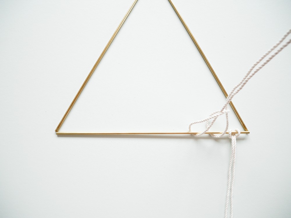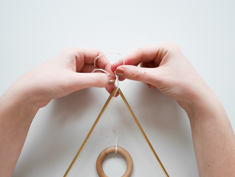 J’ai accroché un anneau de rideau en bois au triangle à l’aide de la ficelle