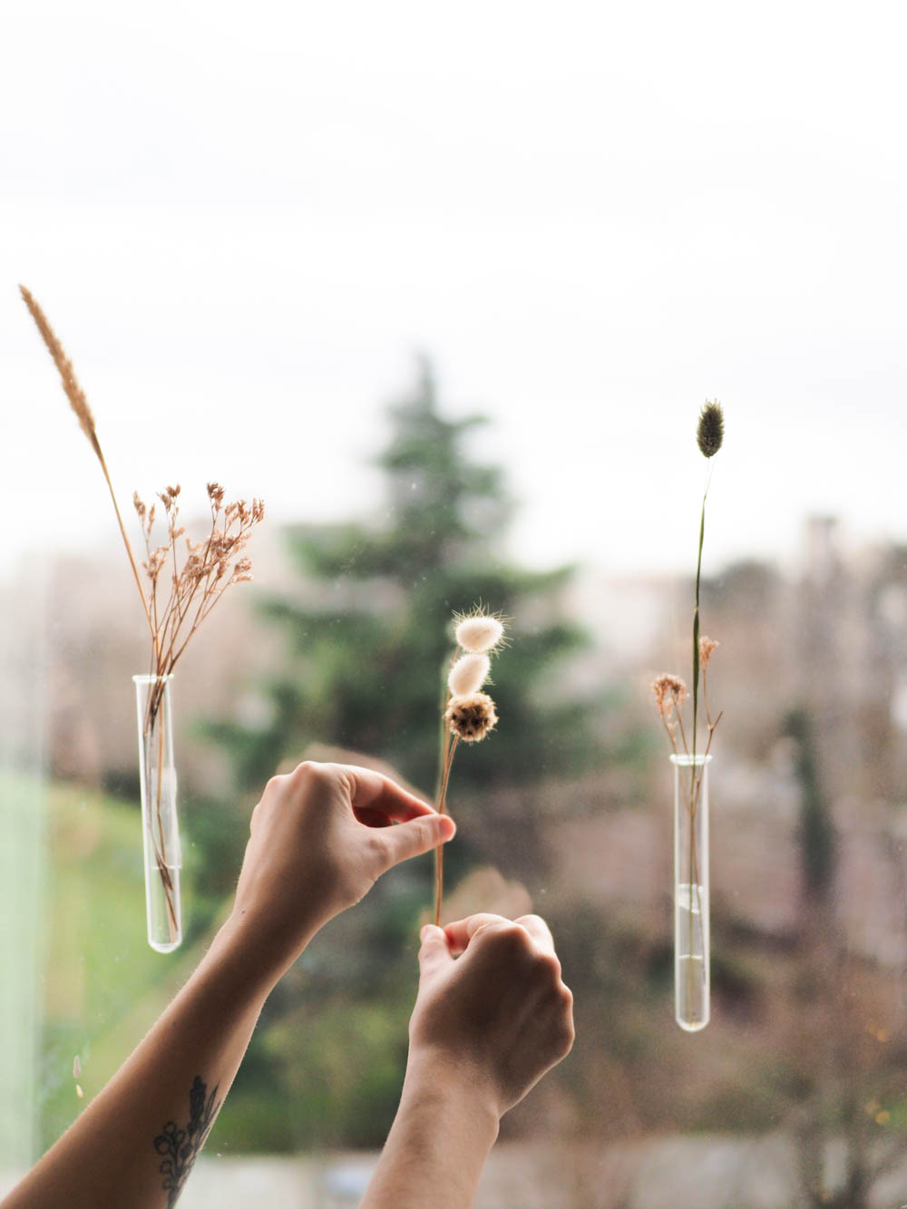 Ensuite, il suffit de mettre les petits bouquets de fleurs séchées dans les fioles, d’y ajouter quelques paillettes pour un effet plus festif.