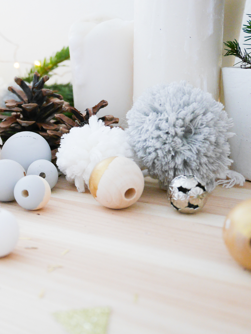 J’aime bien rêver et le côté magique, féérique pour Noël me manque. Du coup, j’ai essayé de recréer tout ça. Pour cette table de Noël j’ai donc réutilisé les DIY de Noël que je vous ai montré hier avec les pompons, mini sapins en balsa, perles de Noël sur mes portes couverts et emballage cadeaux. J’ai peint des petites pommes de pin, ajouté des feuilles d’or sur les bougies, mis de la jolie vaisselle et une magnifique nappe en lin.