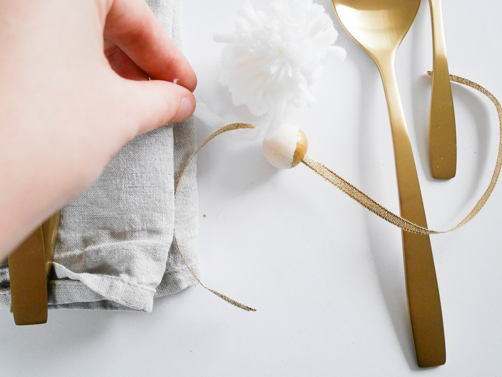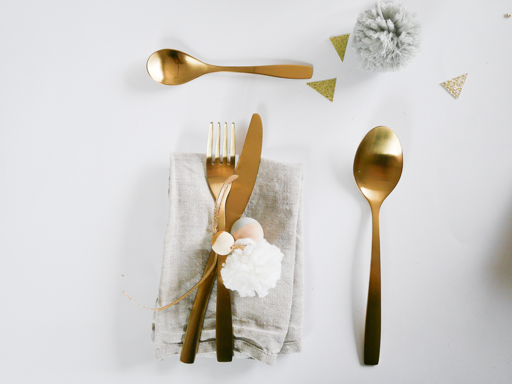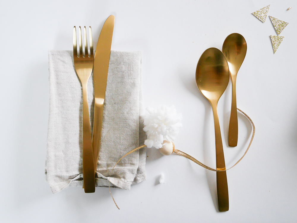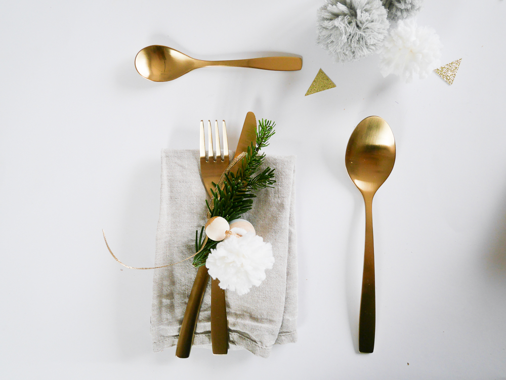 Je ne sais pas vraiment comment cela s’appelle mais l’idée était de faire une jolie déco pour les couverts. Je n’ai pas mis de marques place parce que je trouve ça dommage de dire où chaque personne doivent s’assoir à Noël. A la maison, chacun fait comme il veut. L’idée est très simple, il suffit de prendre un jolie fil doré, y accrocher des perles de Noël et un pompon. Vous attachez vos couverts avec, vous ajoutez une petite branche de sapin et le tour est joué !