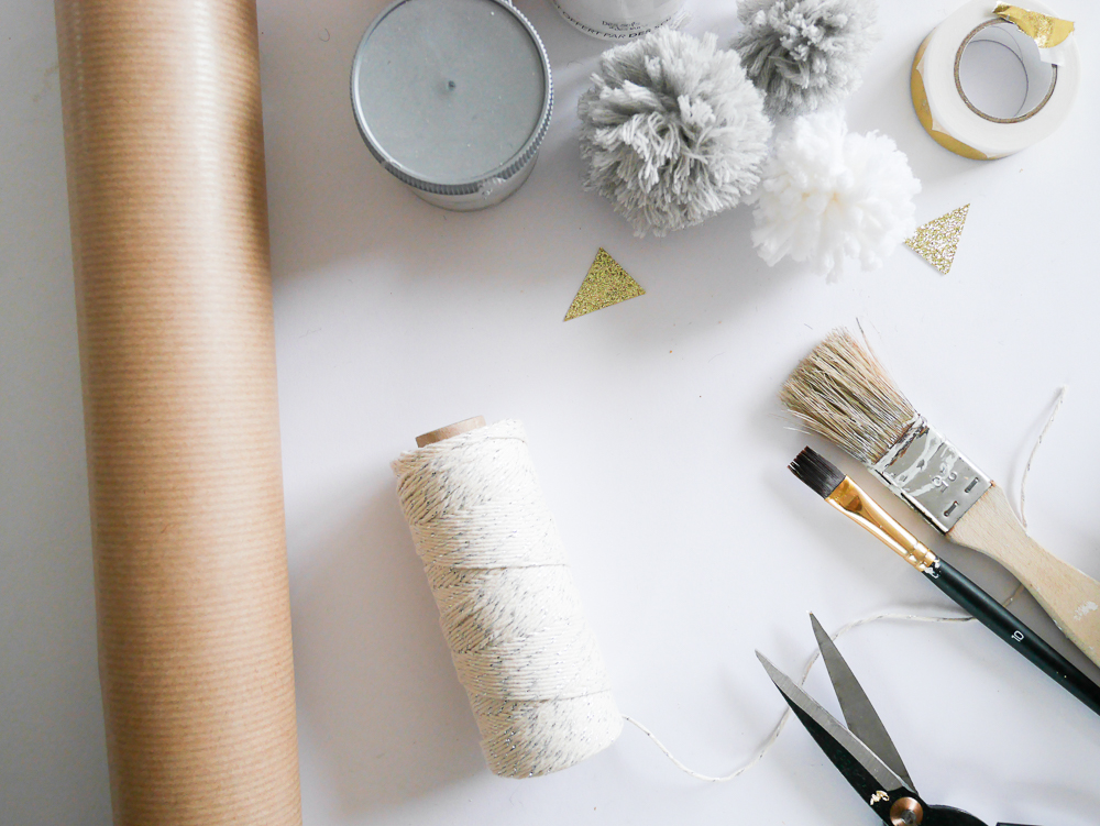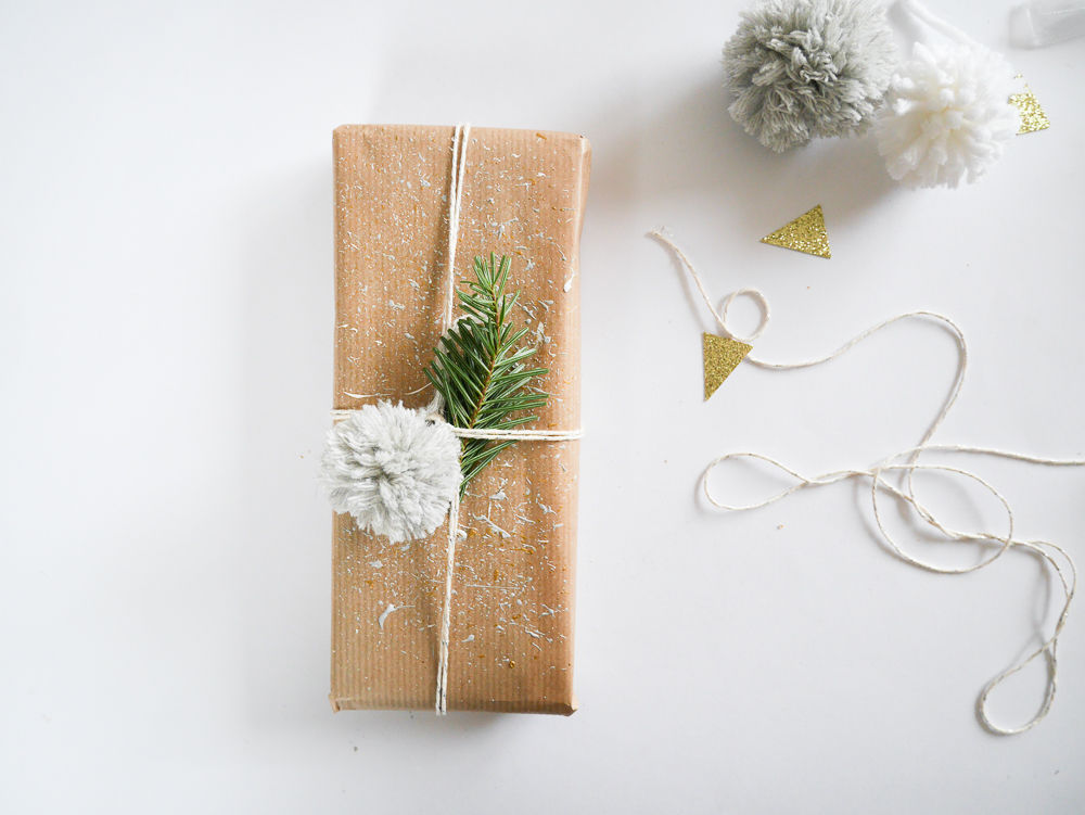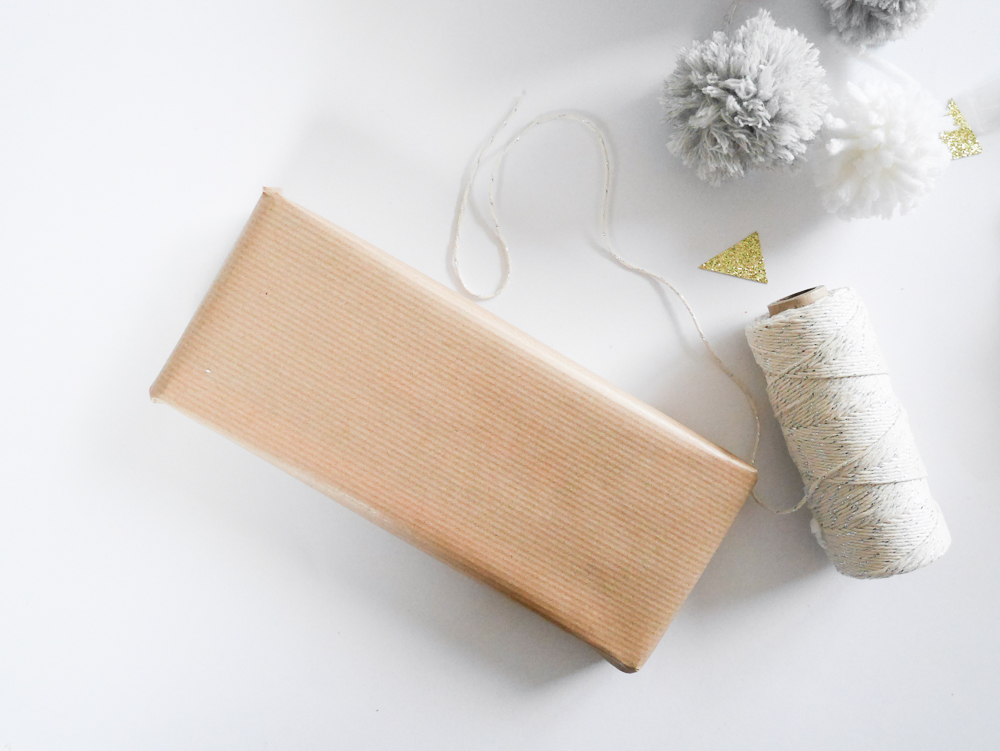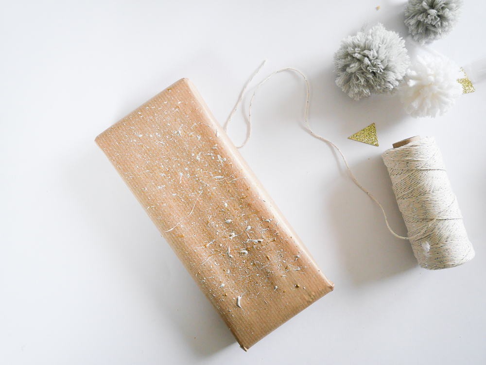 Pour les emballages cadeaux, j’ai utilisé du papier kraft, du baker twine que j’ai noué autour. Mais surtout avant de le nouer, j’ai moucheté à l’aide d’un pinceau de la peinture et du doré dessus. J’y ai accroché un pompon ainsi qu’une branche de sapin.