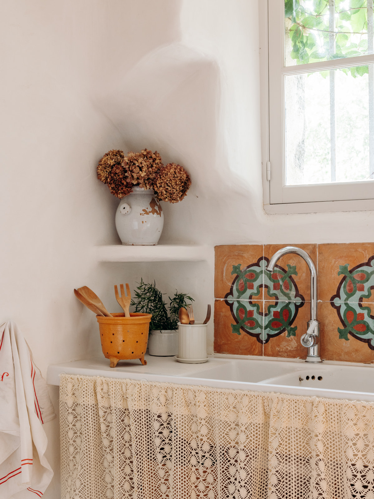 Les tomettes anciennes de toute beauté du sol ont été conservées, les murs ont été enduits de plâtre blanc-cassé, pour homogénéiser l’ensemble et apporter de la lumière.