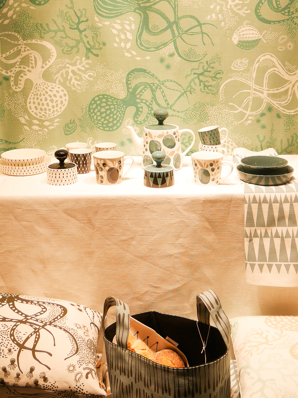 J’ai aussi pu découvrir la collection décoration de la boutique Aime Comme Marie qui d’habitude crée des patrons et tissus. Ici, les filles ont déclinés leurs motifs fétiches sur des plateaux, coussins, boites, cartes, etc.