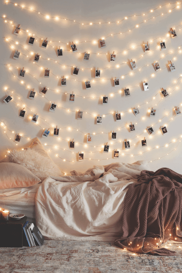 A l’aide d’une ficelle, d’un fil à métal, ou encore avec des guirlandes lumineuses, vous pourrez exposer vos photos de voyages ainsi que d’autres souvenirs. Cela donne un côté assez arty et poétique, et surtout on peut changer les photos au fil des envies et des ambiances que l’on veut donner à la pièce. Vous pouvez même imprimer les photos comme des polaroïds !