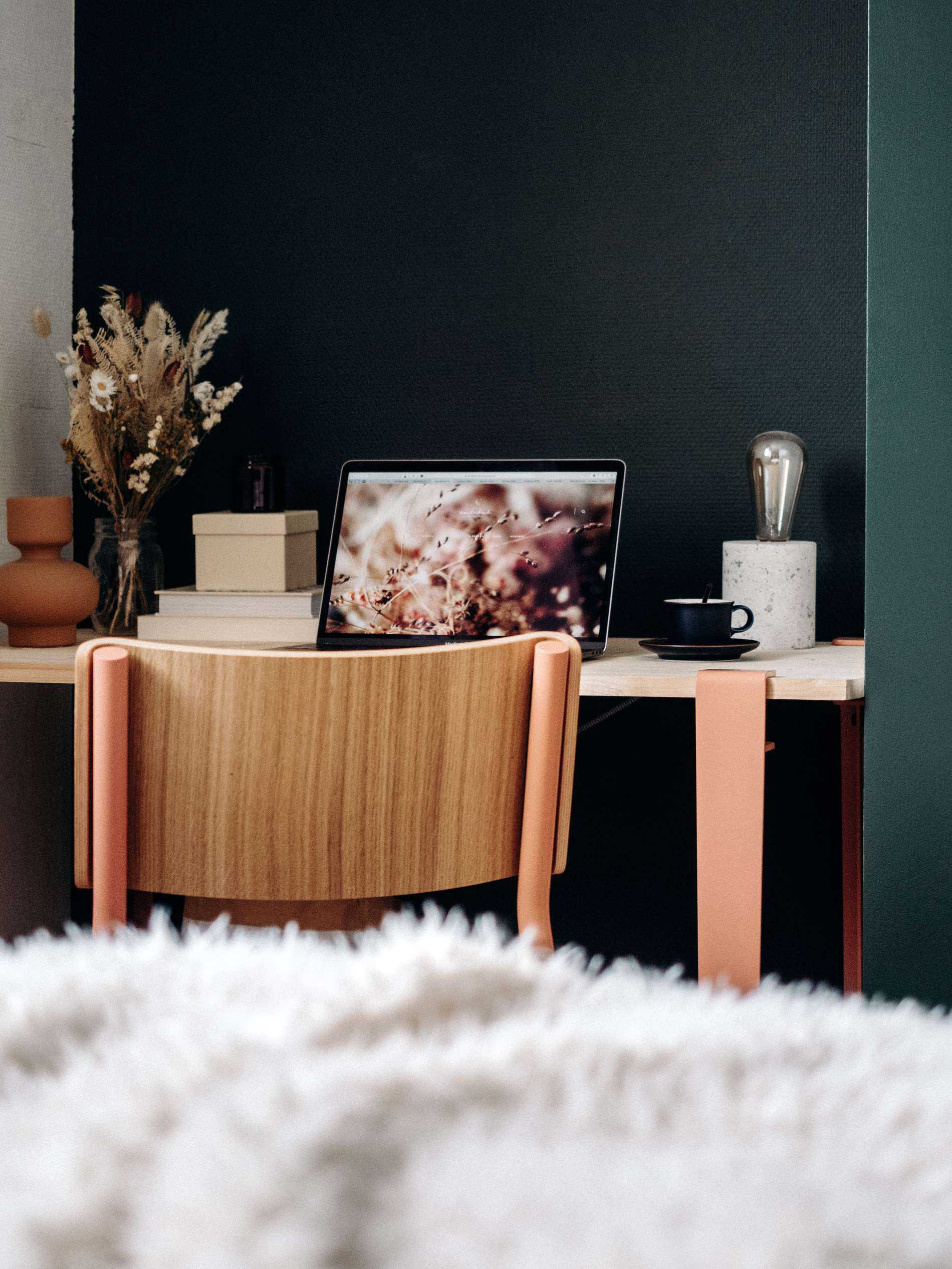 Nous nous sommes orientés sur des pistes, des solutions pour se créer un espace bureau vraiment défini. Nous avons eu pleins d’idées différentes en lien avec nos contraintes de place, nos envies, etc. Finalement, nous avons opté pour un bureau dans la chambre avec la solution Tiptoe. Nous avons emménagé un coin dressing ton sur ton avec la couleur du mur vert foncé et avons laissé une niche pour créer l’espace bureau.