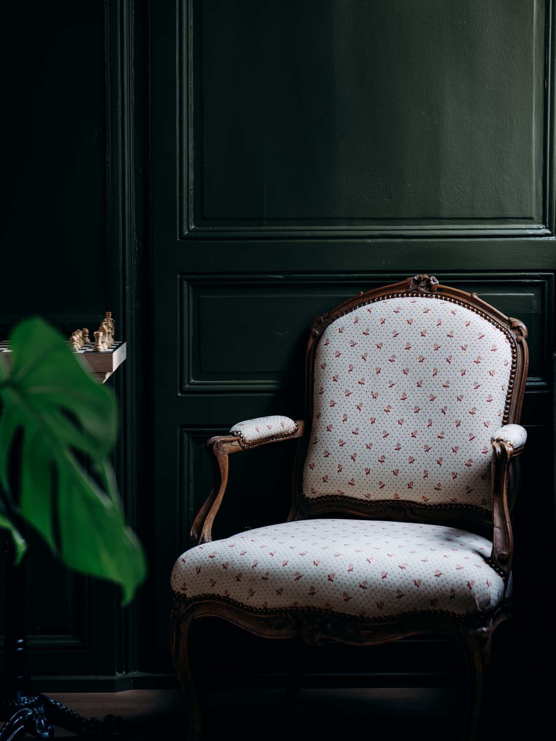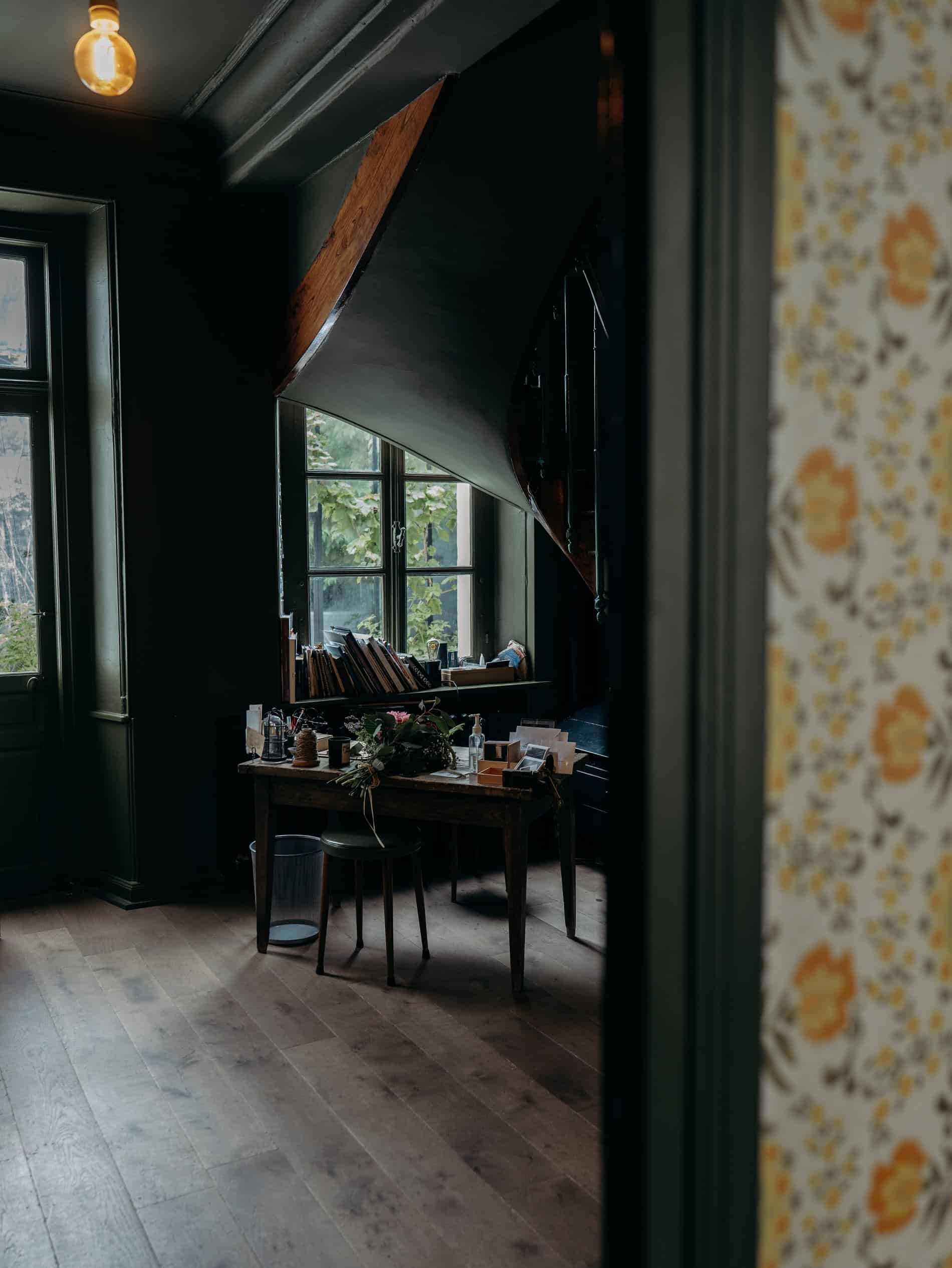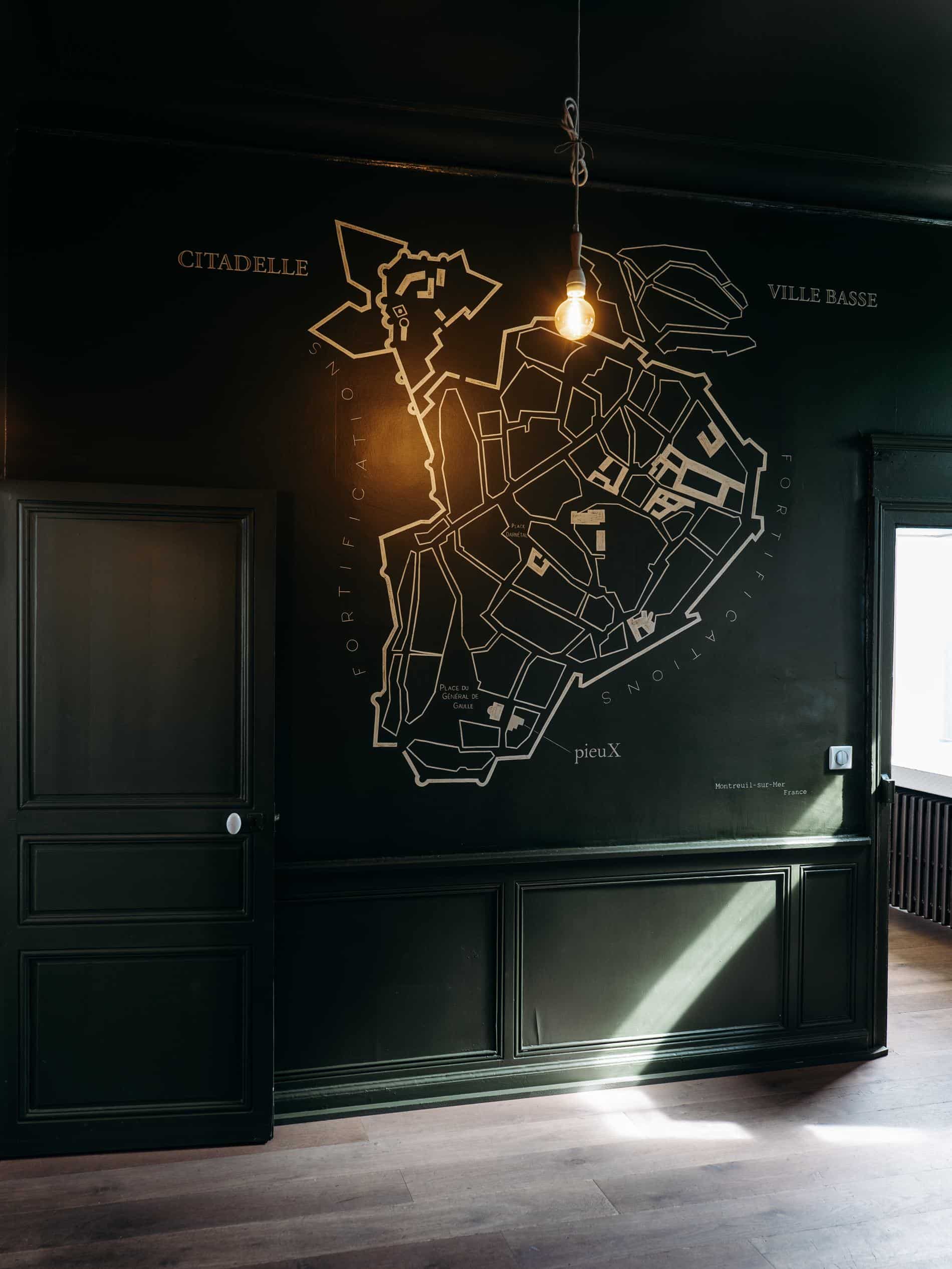 Le rez-de-chaussée est sobre, on passer une entrée avec un papier-peint vintage pour entrée dans une salle avec l’escalier central. Le mur est dans un vert profond avec une carte dessinée de Montreuil-sur-Mer.