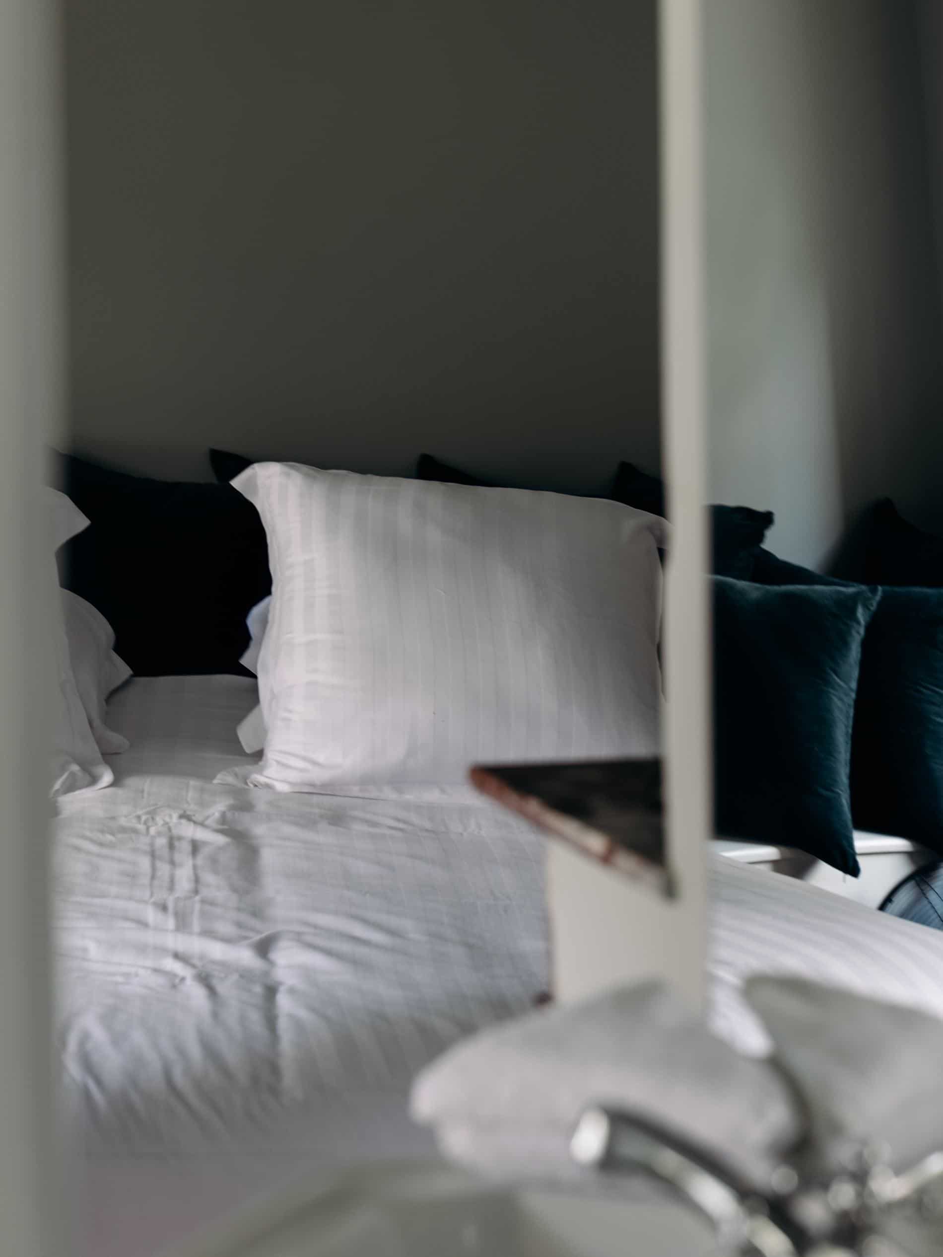 L’autre chambre où nous avons dormi est la Traversin. Une grande chambre jaune traversante baignée de lumière avec une niche arrondie absolument charmante ! J’aime la partie estrade de la salle de bain ouverte sur la chambre. J’aime ce jaune un peu sourd, et surtout les formes de cette chambre. C’est mon coup de coeur.