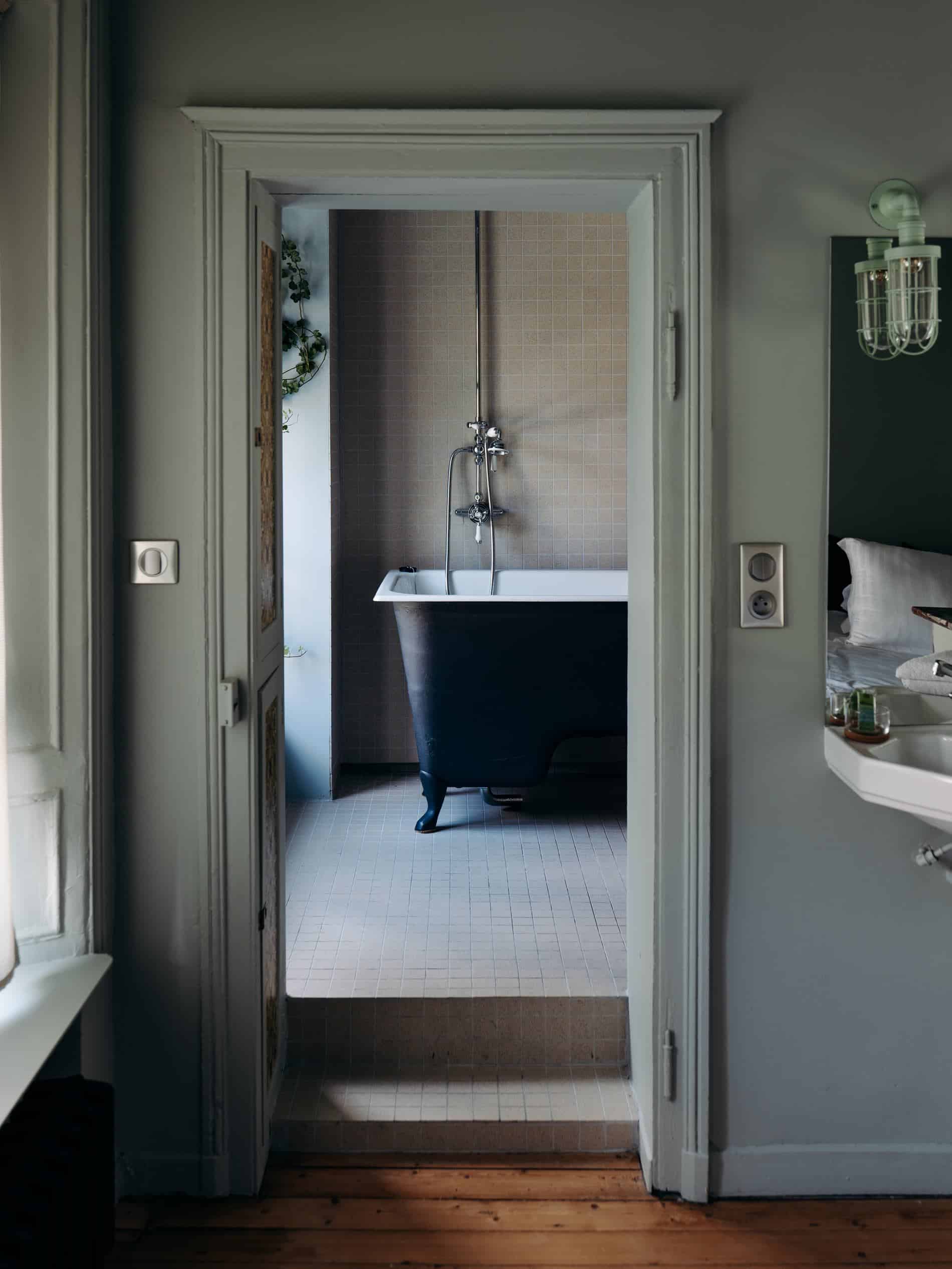 Nous avons séjourné dans la Cachette puis dans la Traversin. La Cachette a de très belles nuances de vert, et à une particularité de par son entrée. Une véritable « cachette ». J’aime aussi la magnifique baignoire sabot vintage. Une petite chambre parfaite.