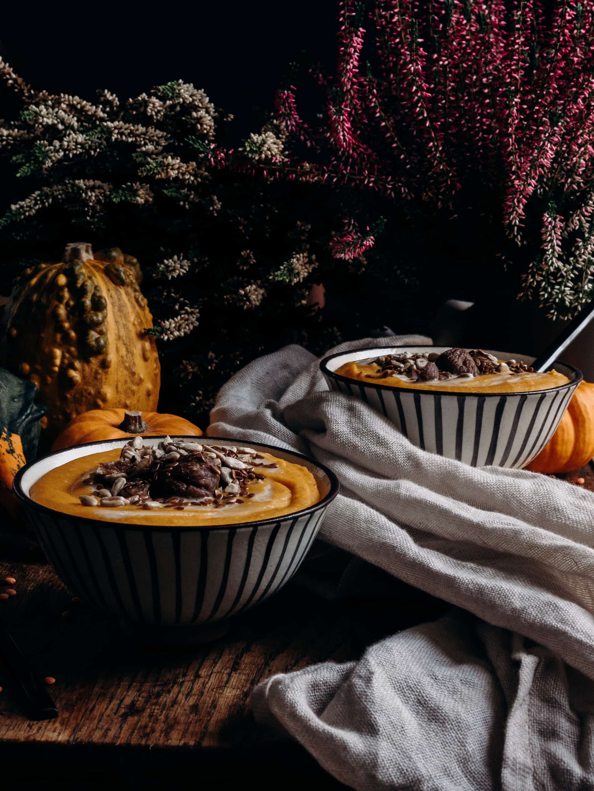 Avant, je n’aimais pas les soupes, je trouvais ça triste et sans grand interêt mais à l’Automne avec les courges et lorsqu’on rajoute des petits plus sympas. Je commence à apprécier fortement. Par exemple, on peut ajouter des petites tartines à côté, du lait de coco ici, ou des châtaignes par là, je fais tout pour égayer mes petites soupes pour en faire quelque chose qui me fait plaisir et qui me rend gourmande !