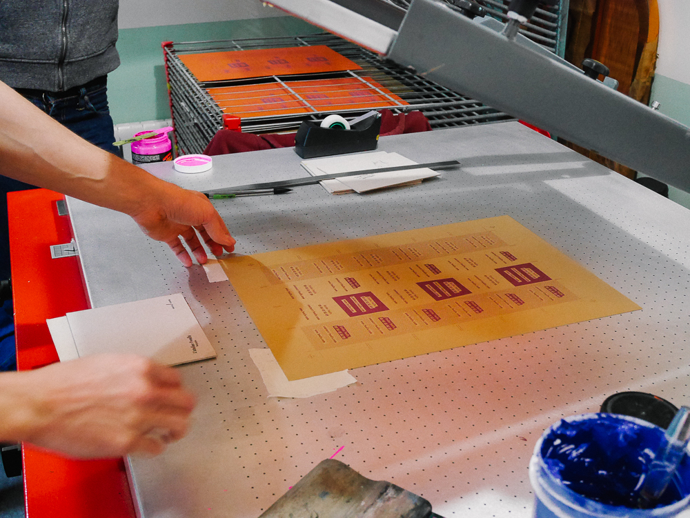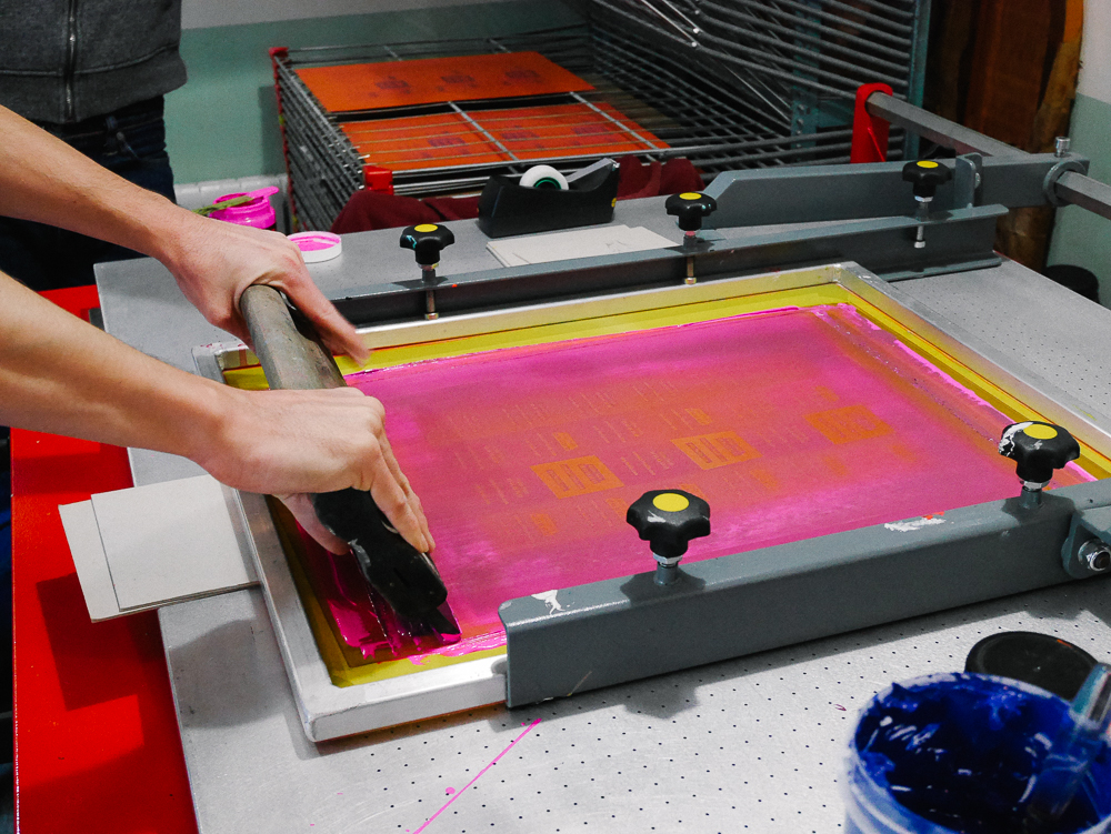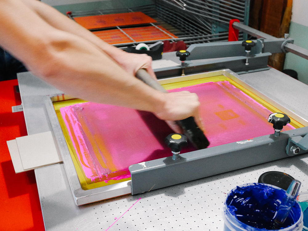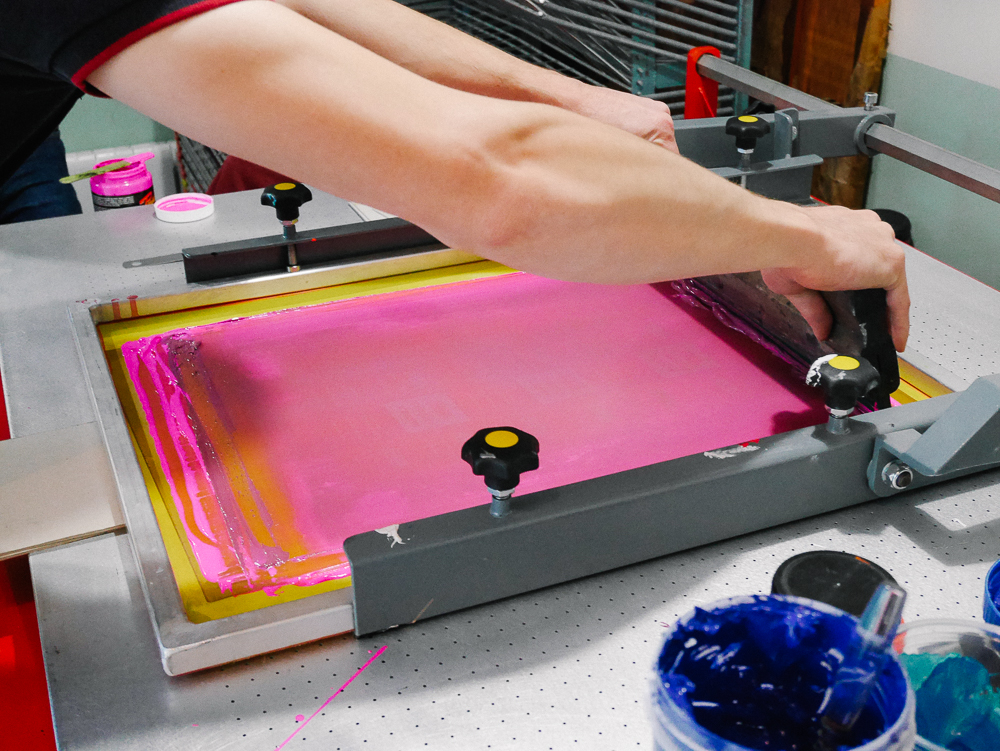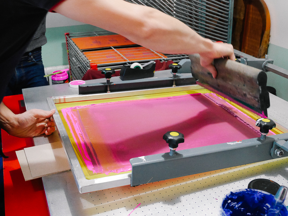 Une fois l’écran fixé, on vérifie bien que l’écran est hors contact avec le papier, il faut laisser une certaine distance entre les deux pour que cela ne bave pas. On dépose l’encre en haut de l’écran et à l’aide de la raclette, on va appliquer l’encre et à travers les mailles ouvertes de l’écran, l’encre va se déposer sur le papier.