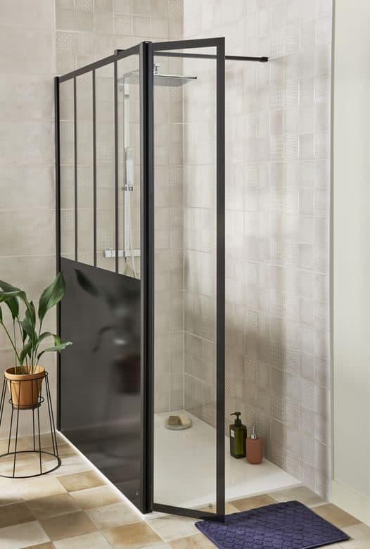 Cette dernière se compose d’un receveur, d’une paroi de douche (en verre, prolongement d’un mur) et d’une robinetterie encastrée.
