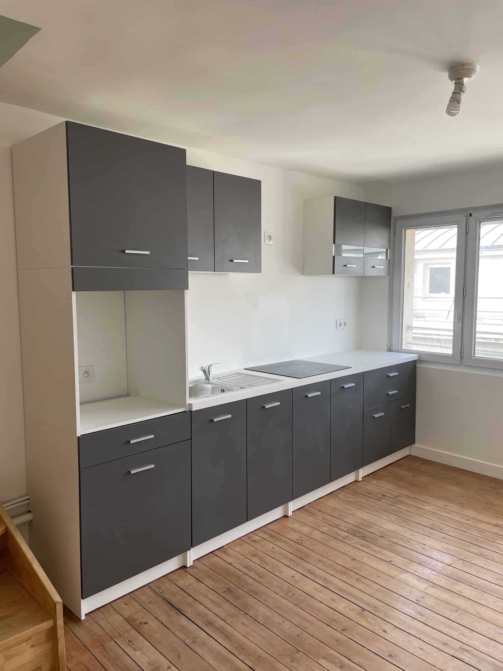 La cuisine que nous avions était basico/basique, sans charme, avec des portes grises, sans emplacement pour le frigo. Tout avait été posé à la va-vite pour faire neuf. Au delà du style qui ne nous ressemblait pas, elle n’était pas du tout pratique.