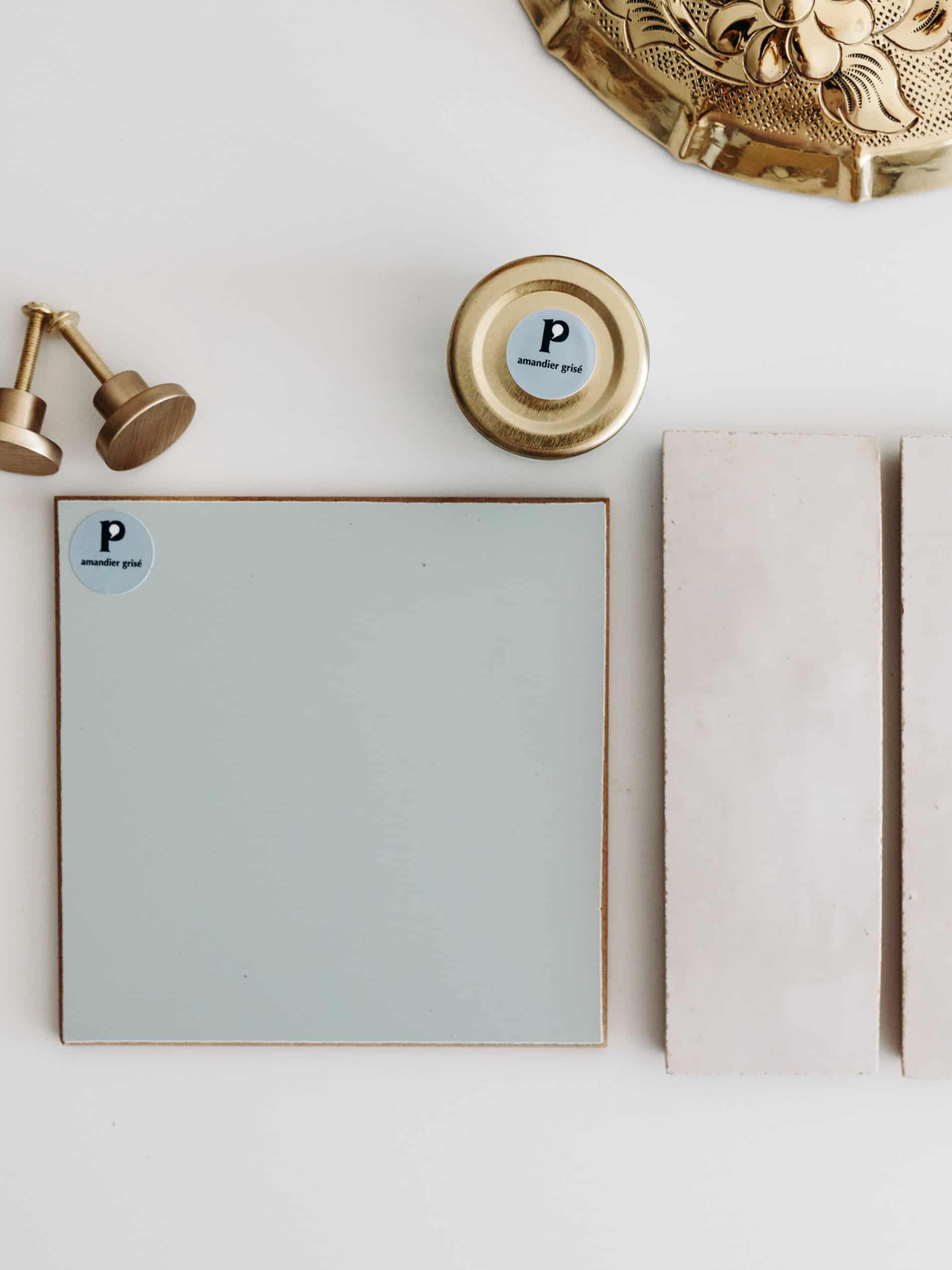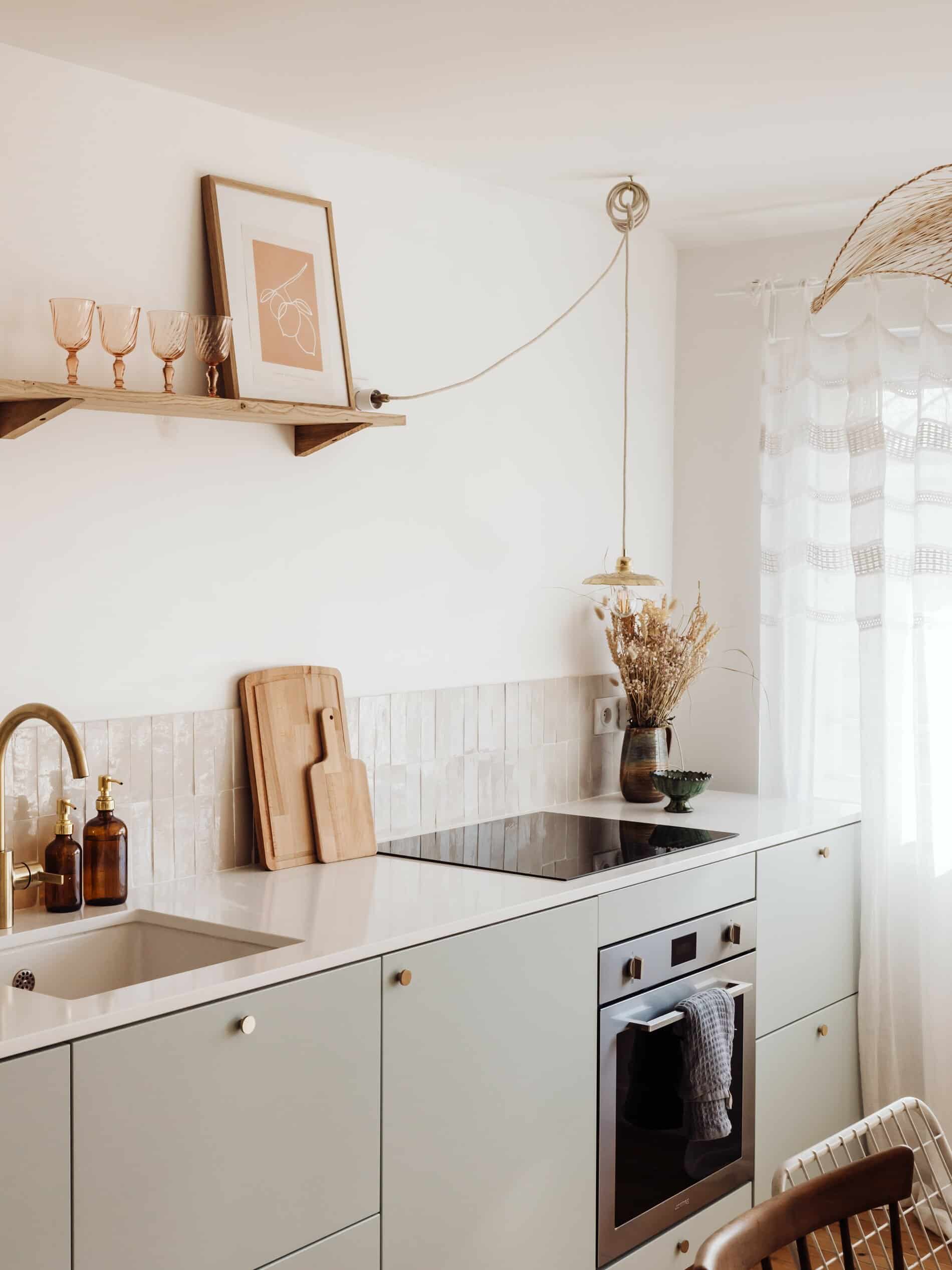 Nous souhaitions une cuisine toute douce, avec un mix d’objets vintages et du neufs, des étagères ouvertes comme à la maison, une suspension dorée et des façades de portes vert amande. On souhaitait un maximum de choses cachées dans cette petite cuisine. Donc même si c’était un petit frigo, il fallait qu’il soit sous le plan de travail, etc.