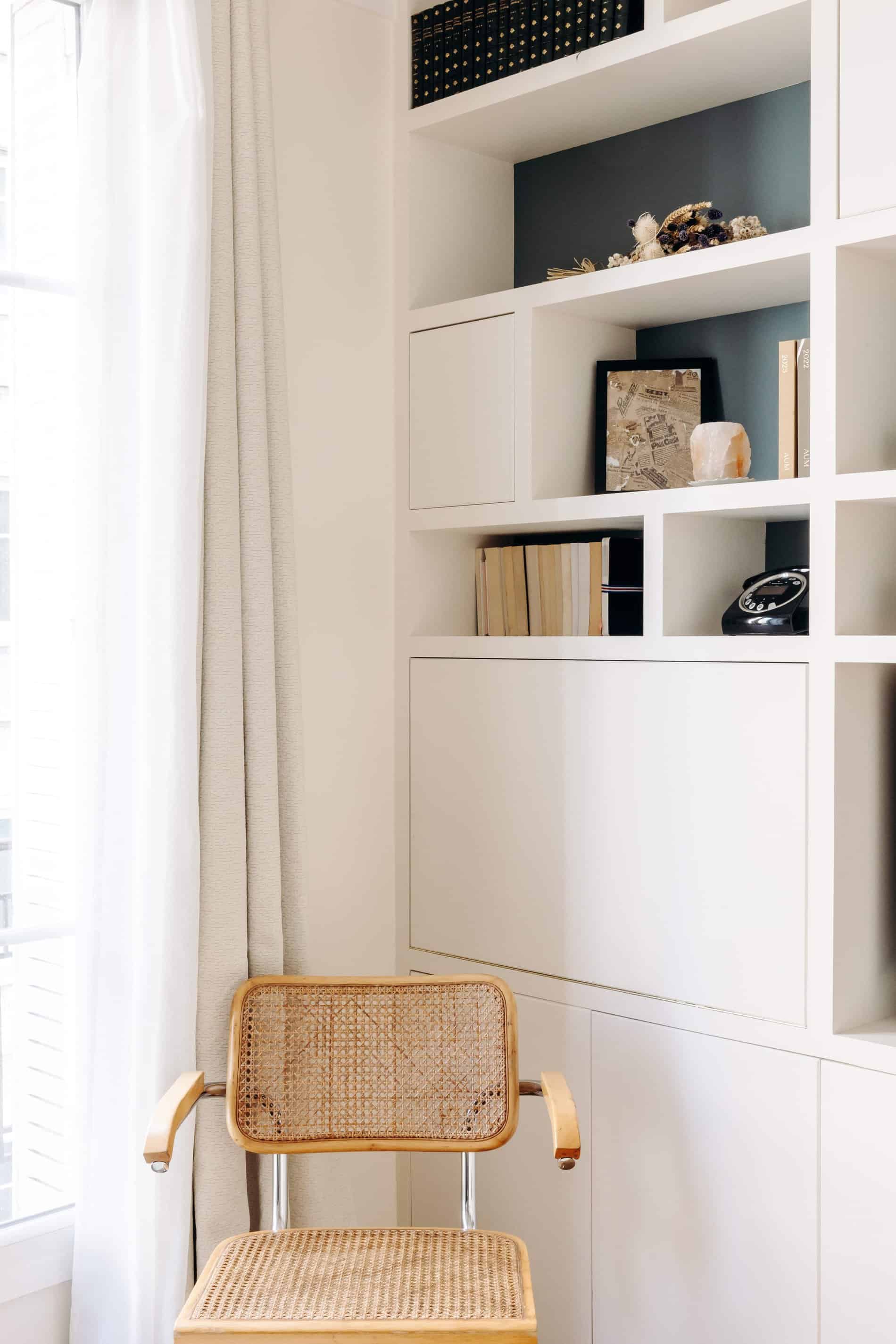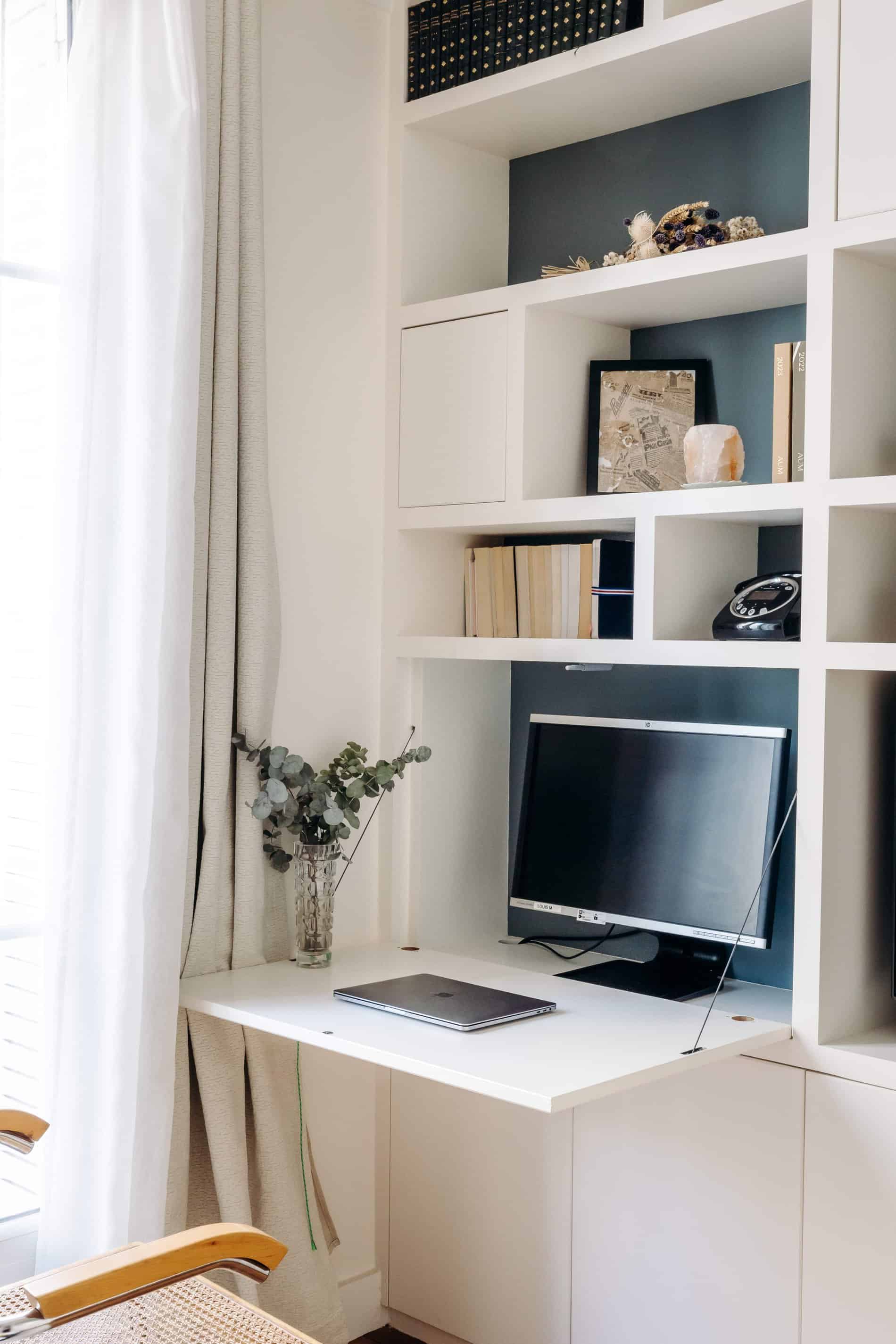 Enfin, le gros plus c’est la grande bibliothèque sur mesure a été fabriquée dans la pièce de vie, elle permet de ranger des livres, exposer de la déco et cache un petit bureau qui peut être fermé lorsque ma cliente ne travaille pas.