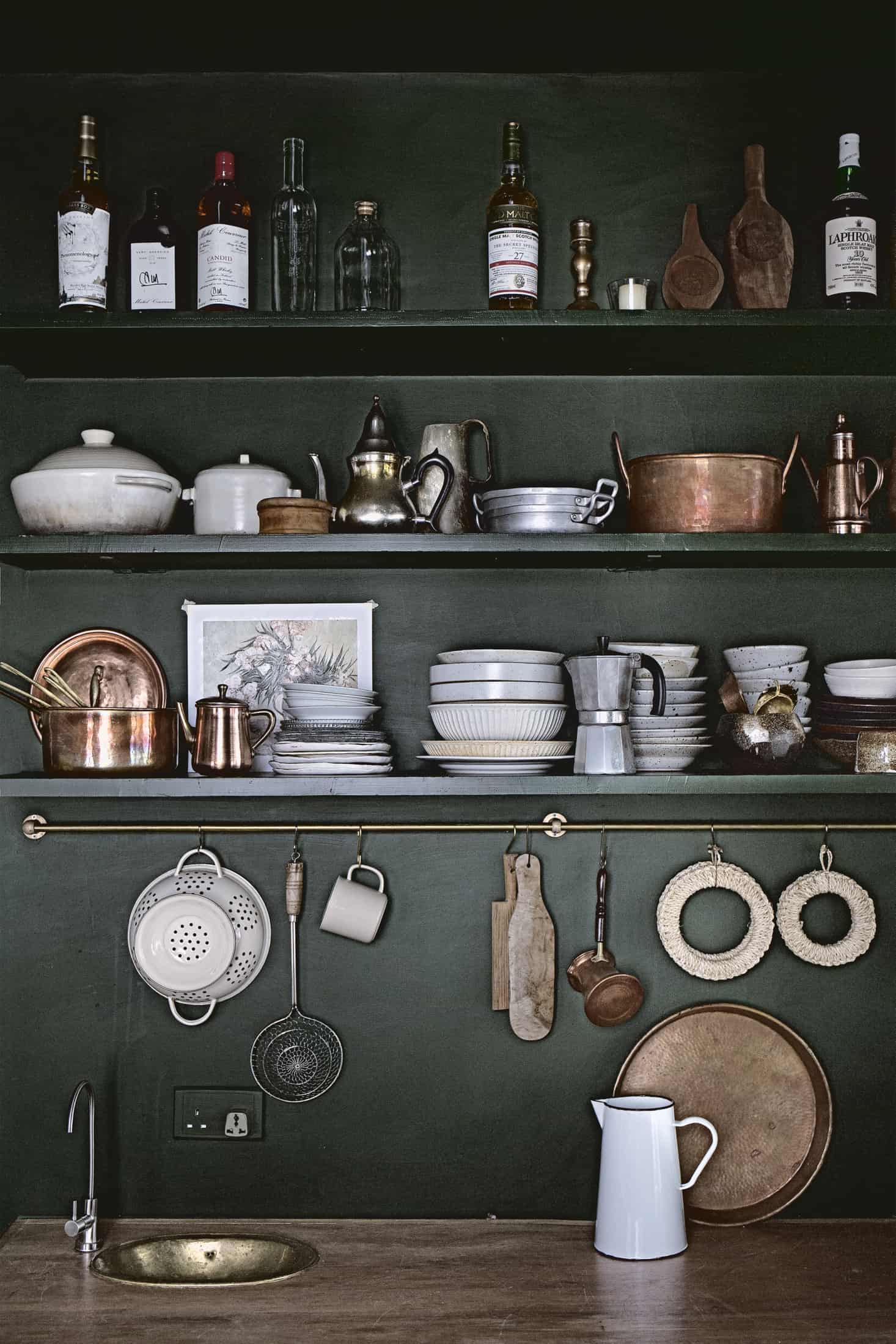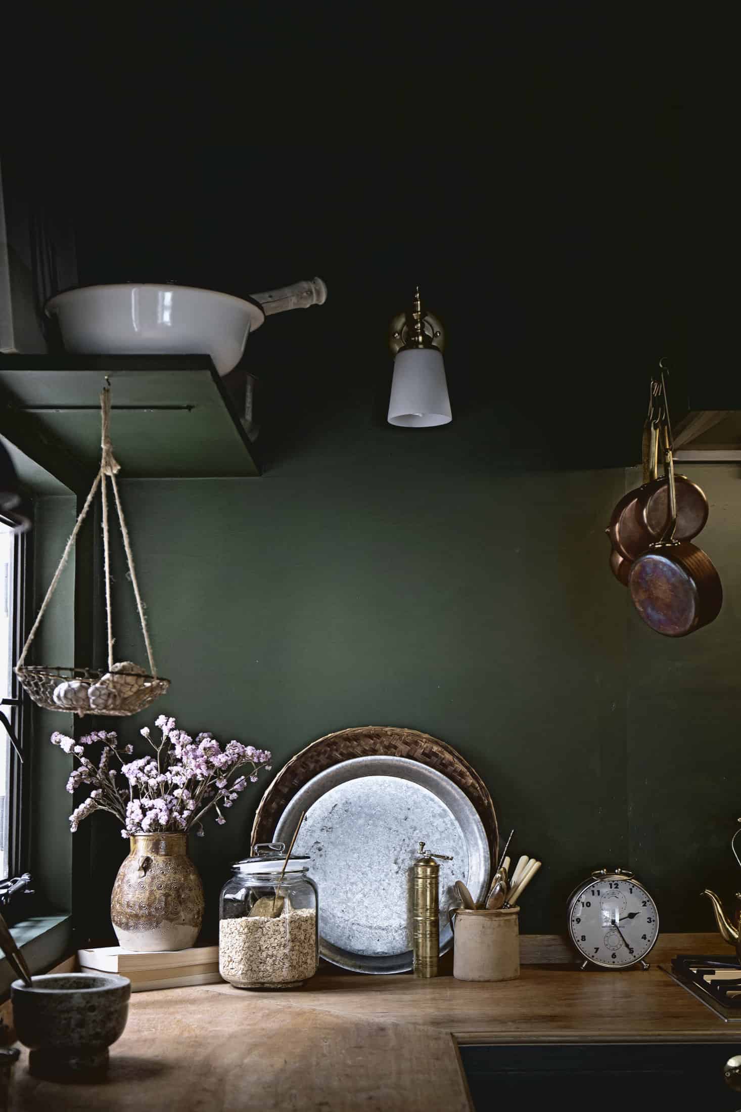 On retrouve pleins d’éléments chinés en étant tout de même épuré. Les murs sont textures, il y a des jolies matières avec les rideaux un peu partout, et les couleurs sont douces. Mon coup de coeur visuel est la cuisine, elle se démarque par sa couleur verte profonde, un petit régal pour les yeux, non ?