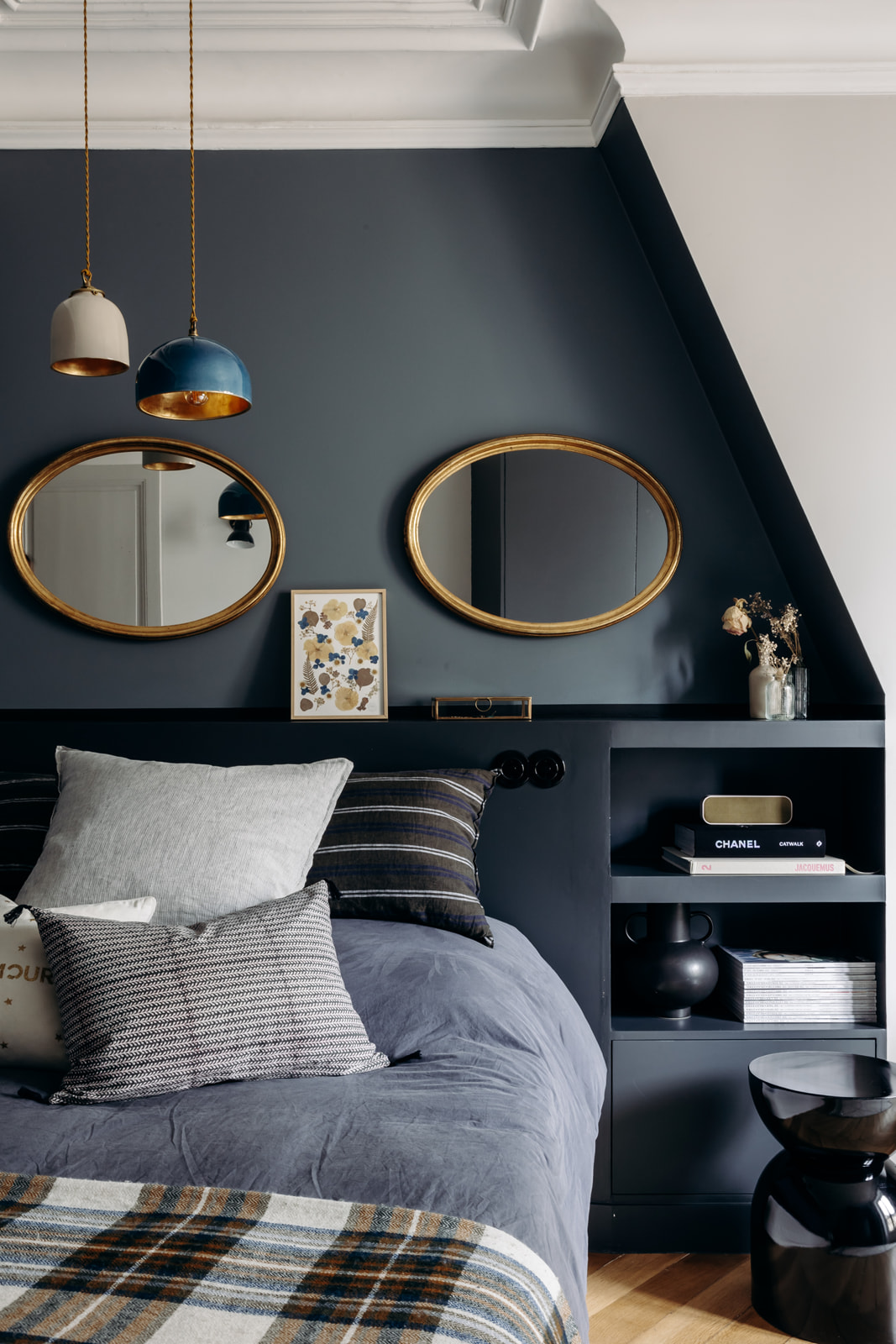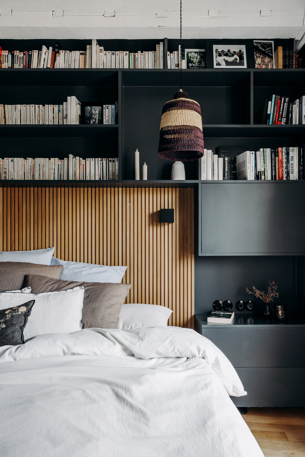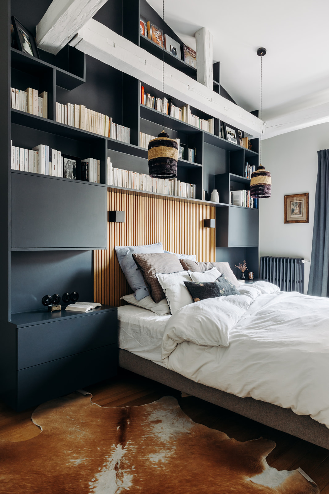 J’aime aussi bien sur la chambre parentale avec cette magnifique hauteur sur plafond et les poutres apparentes ! et quelle bibliothèque !