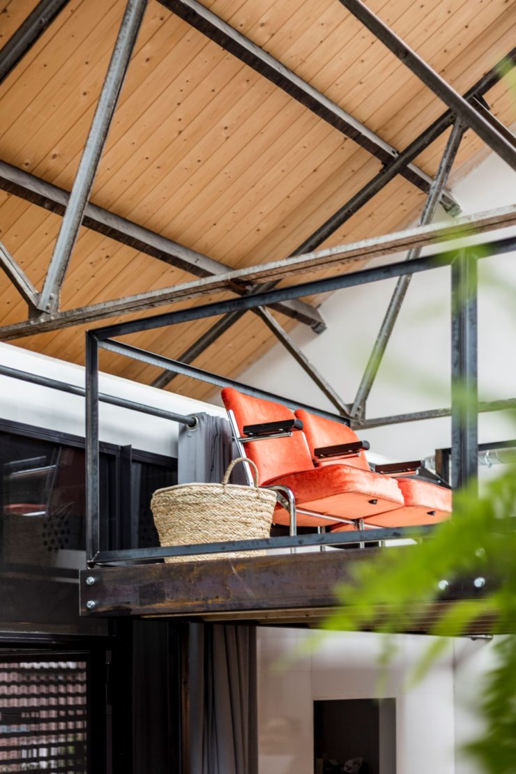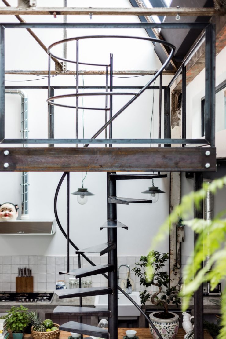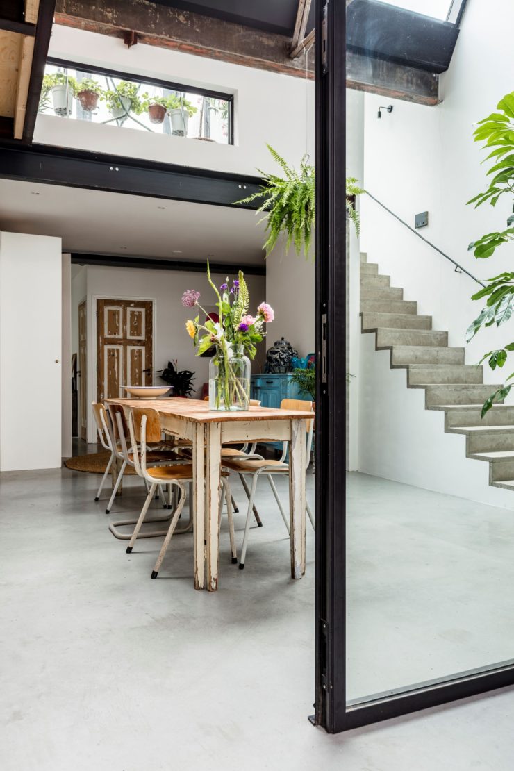 On y retrouve du style industriel avec des poutres, un escalier métallique, le sol en béton ciré , mais aussi des matériaux bruts, du blanc, de la belle patine ! Bref, de quoi plaire !