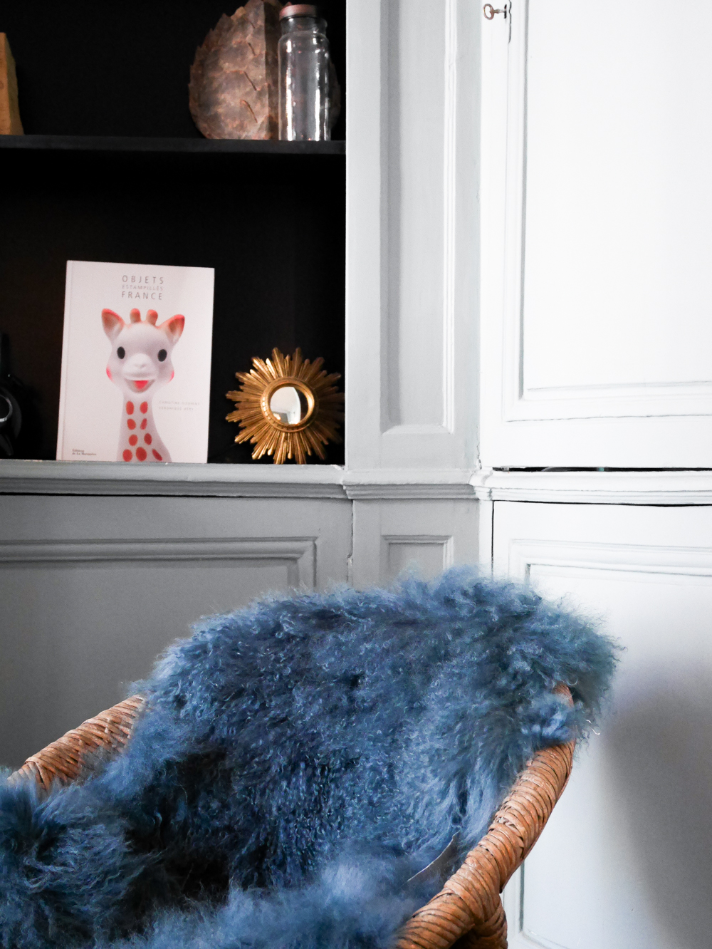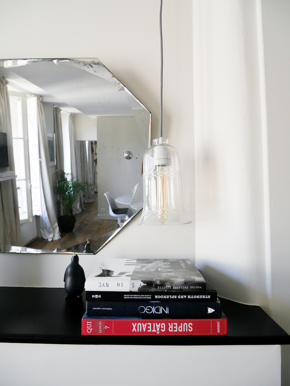 Sur le premier étage, vous trouverez donc l’appartement dit « classique », je n’ai pas pu le visiter. Je vous invite à aller voir sur le site de Laurence, il est vraiment très beau. Au deuxième étage, on trouve un appartement au style beaucoup plus « contemporain ». Avec des beaux contrastes, un parquet brut, des éclairages indirects et une superbe salle d’eau ouverte sur la chambre.