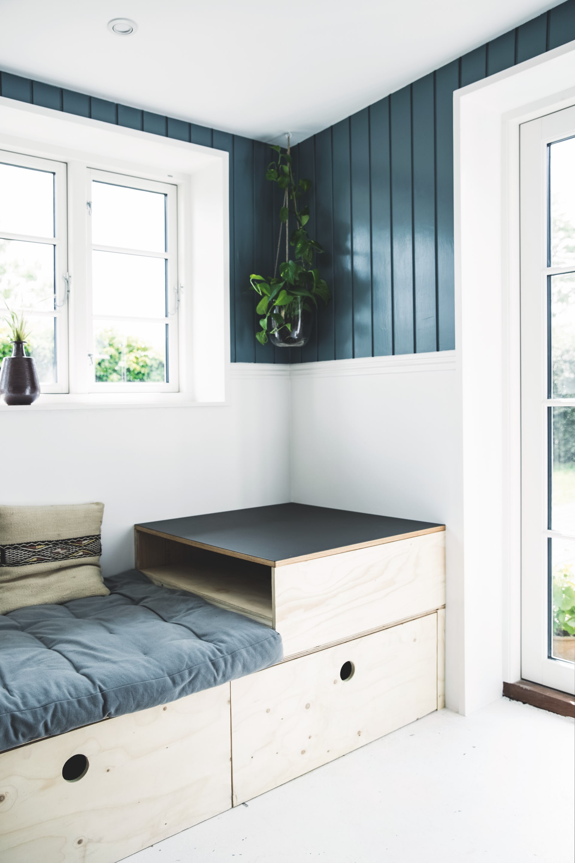 Je suis fan de la véranda, un coin confortable avec un grand canapé DIY top, de nombreux textiles doux et un poêle à bois pour les soirées fraîches. Les murs en bois sont peints en vert pétrole, mais ils sont cassés par des panneaux peints en blanc et des appuis de fenêtre qui donnent à la pièce une apparence claire et aérée, bien que la famille y stocke beaucoup de choses. J’aime beaucoup cet espace.