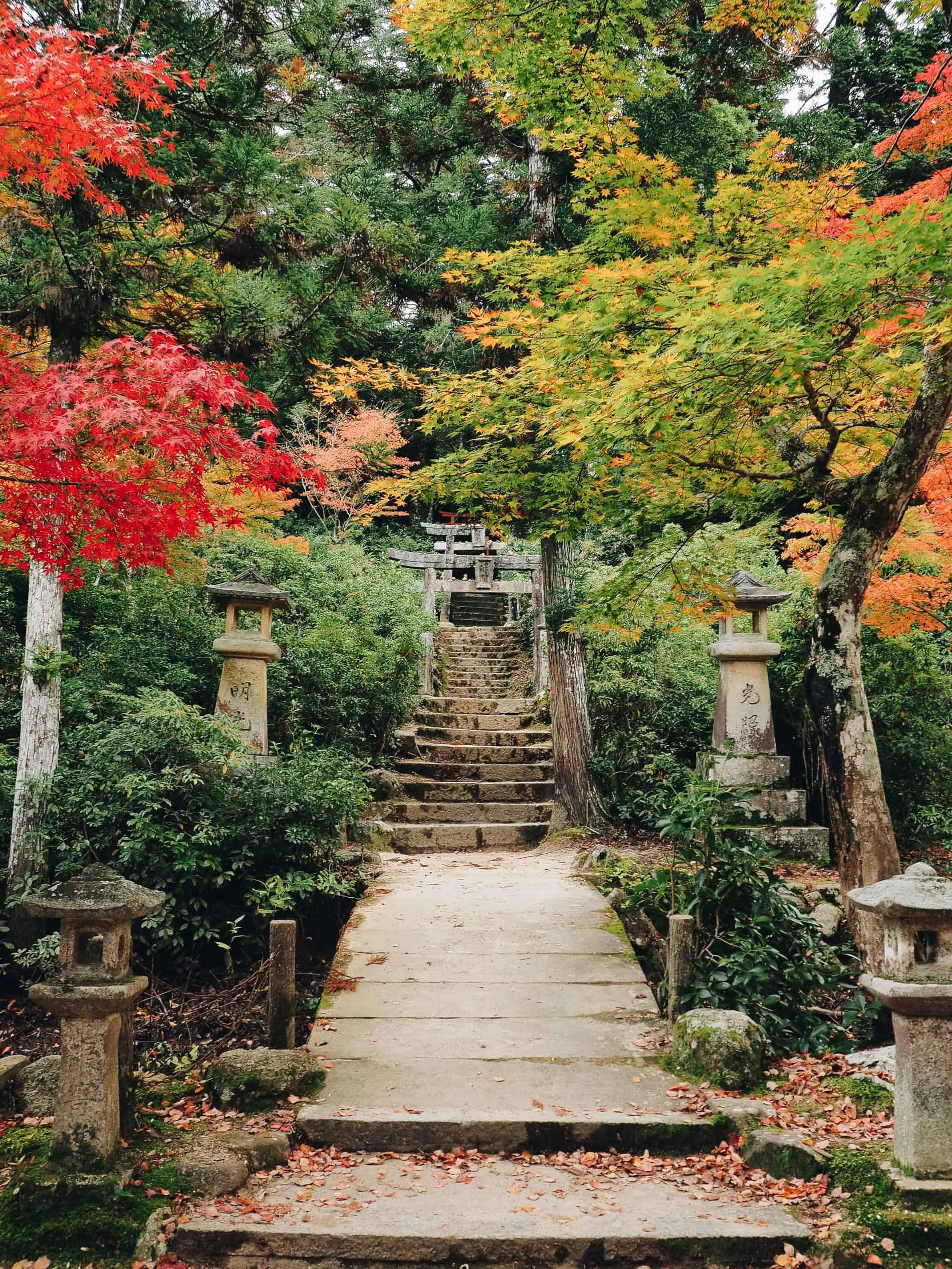 L’autre chemin est celui du Daisho-in, il est a priori de difficulté moyenne… la principale difficulté réside dans ses 2000 marches.Il s’étend sur 3 km et un peu plus long car on croise des temples et jolis sanctuaires à admirer. J’avoue j’étais lessivée en arrivant en haut du Mont Misen, les marches m’avaient tuées !