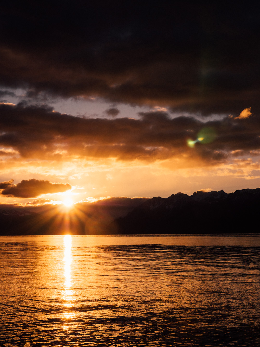 Puis nous sommes montés à la cathédrale et avons admiré le magnifique coucher de soleil sur le lac. C’était magique ! Il commençait à « négoter », les nuages étaient menaçants, et la lumière doré du soleil couchant perçait.